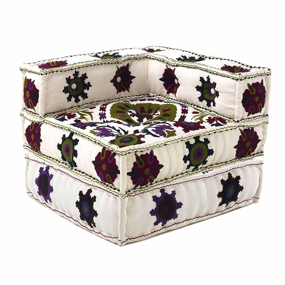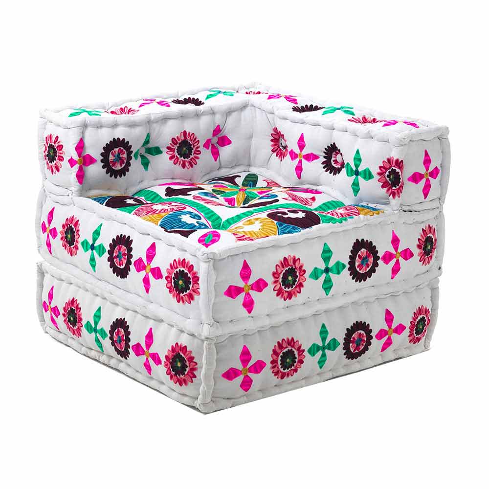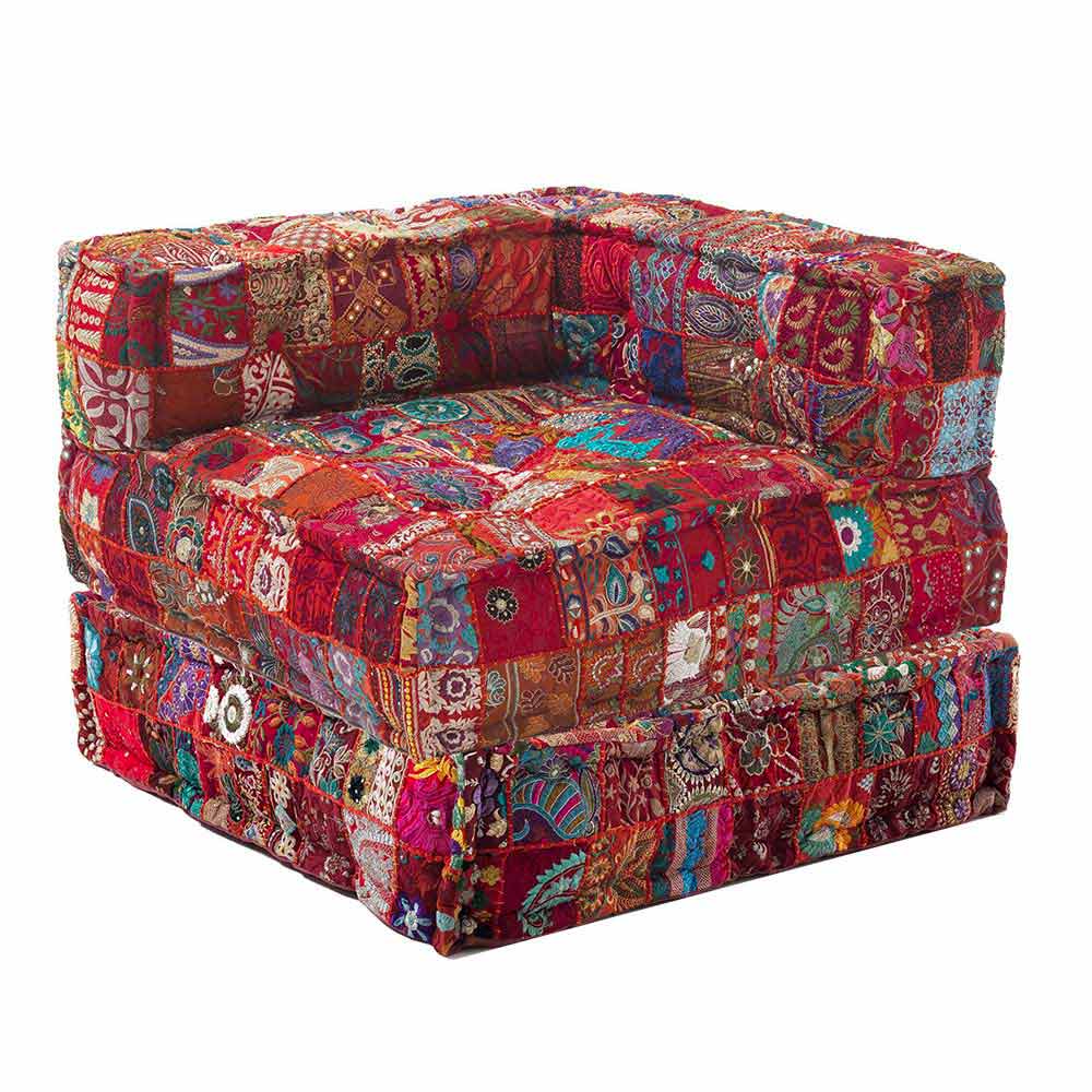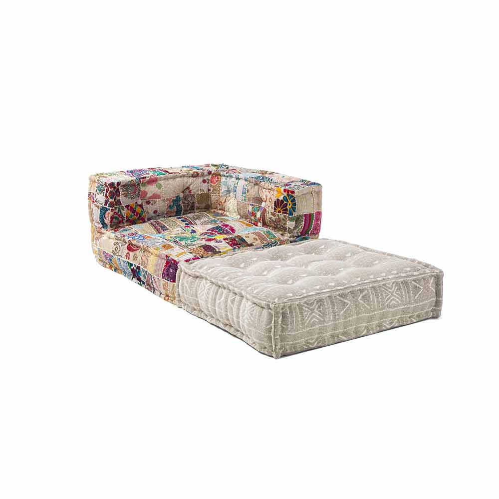 Poltroncina chaise longue di design etnico da salotto in cotone colorato patchwork.