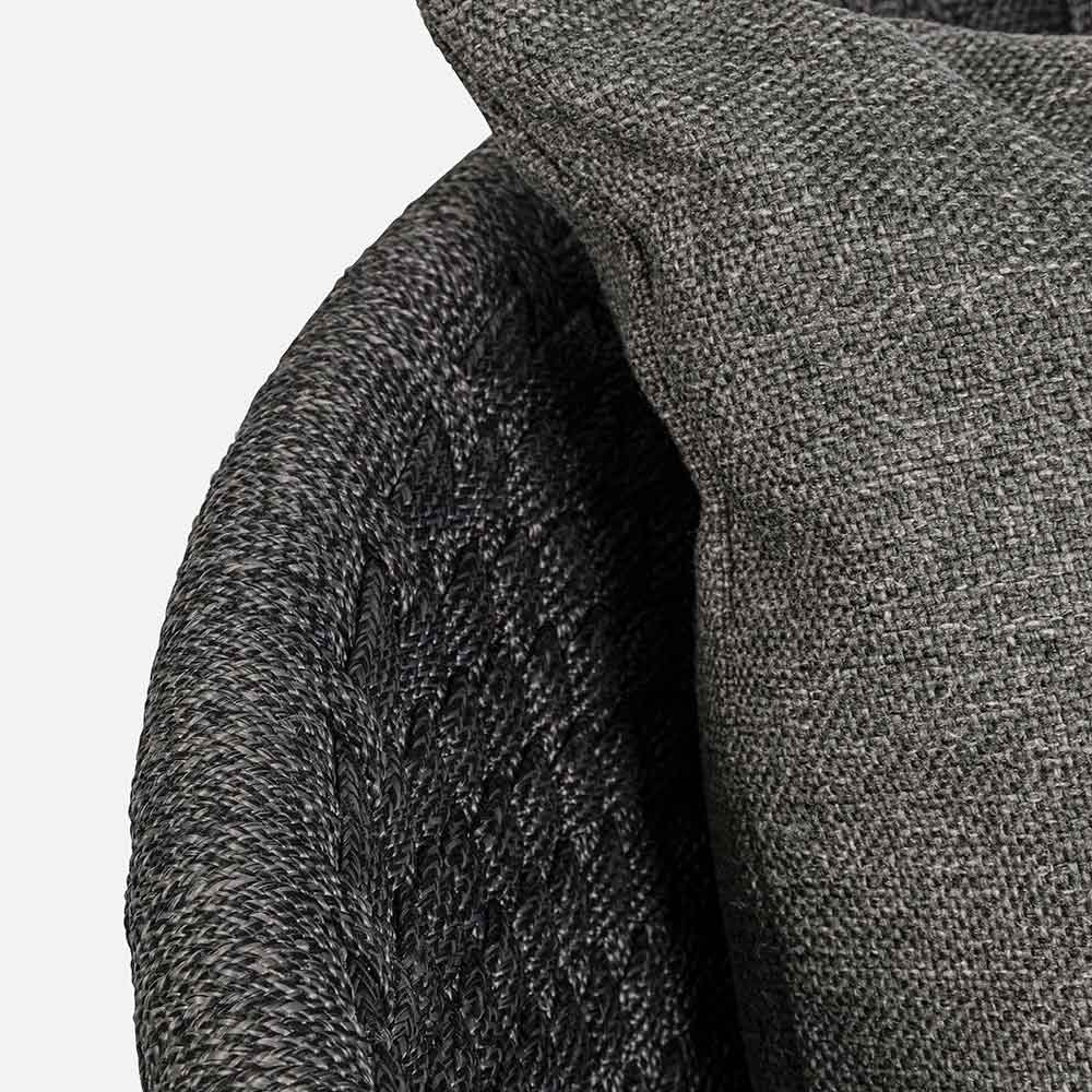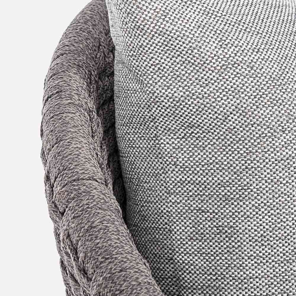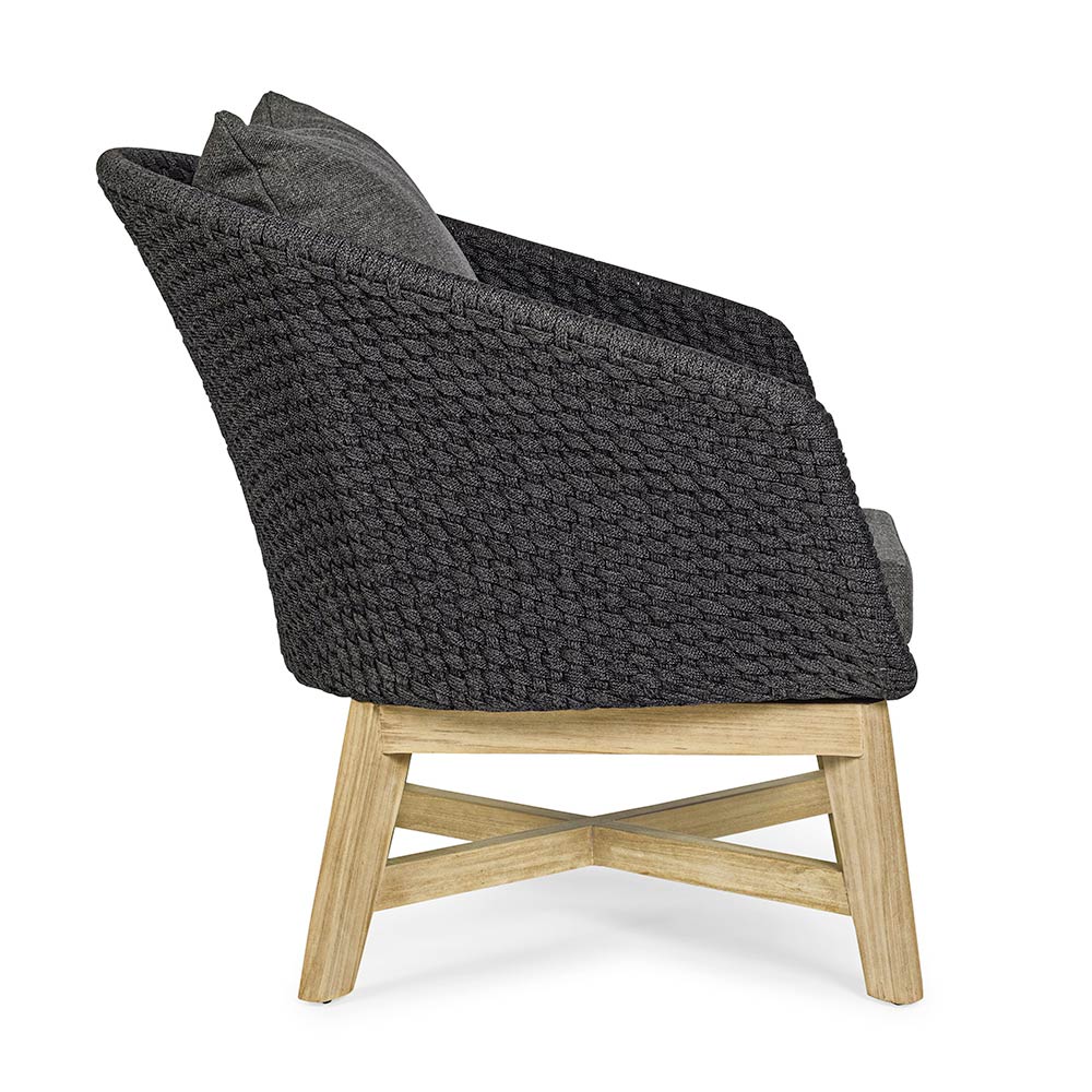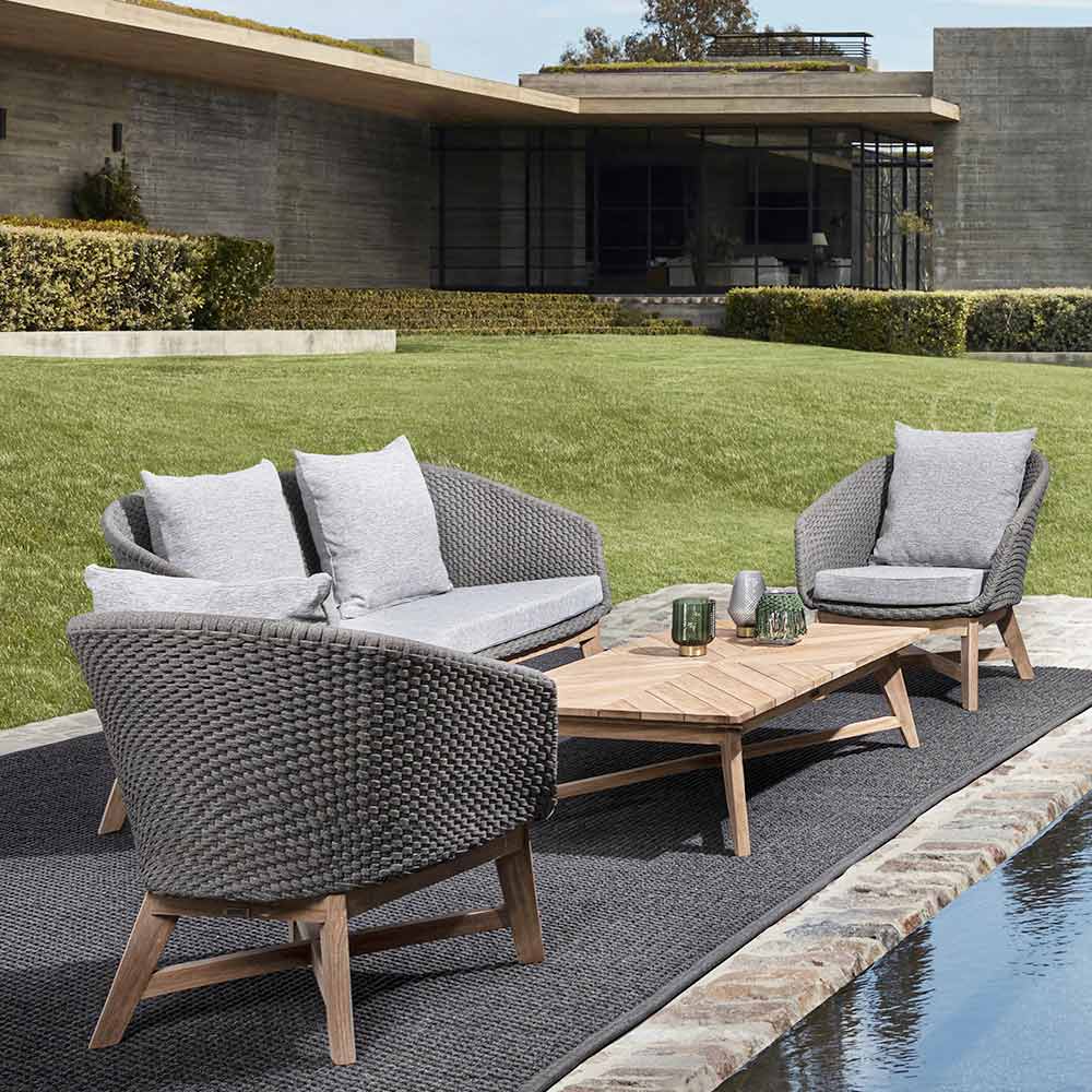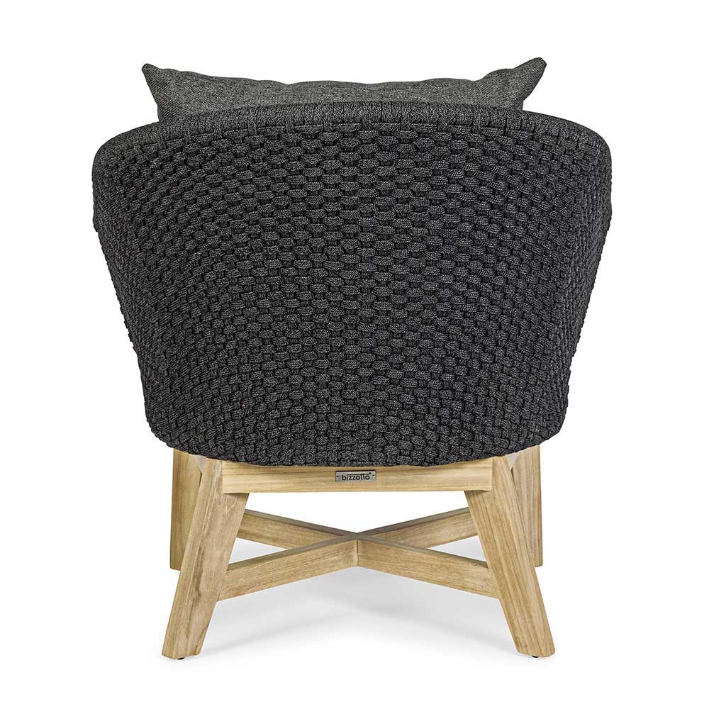 Poltrona da esterno di lusso in intreccio di corda con cuscini in tessuto sfoderabili.