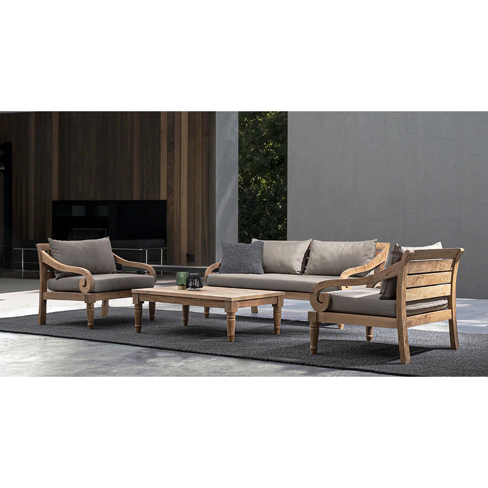 Struttura in legno teak FSC 100% finitura rustica naturale. Cuscini sfoderabili con tessuto Sunproof Olefin (100% polipropilene).