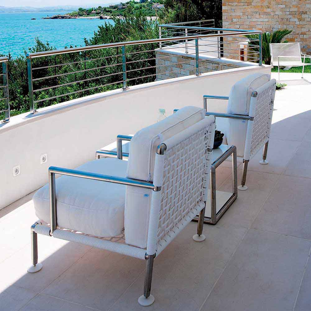 Collocabile in un angolo del terrazzo, nel giardino o in tutti gli spazi dove si possono ricreare momenti di serenità e relax senza rinunciare allo stile inconfondibile del made in Italy, la poltrona ha una struttura in