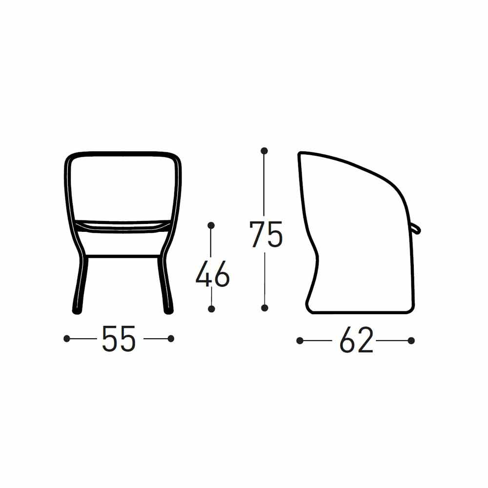 Il design della struttura unisce gambe e schienale in un’unica superficie, che si restringe leggermente sotto il sedile per mantenere una maggiore stabilità.