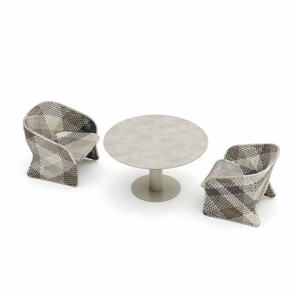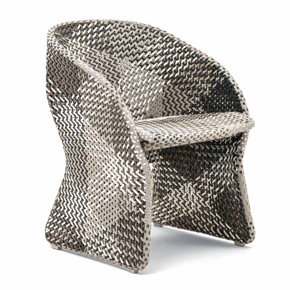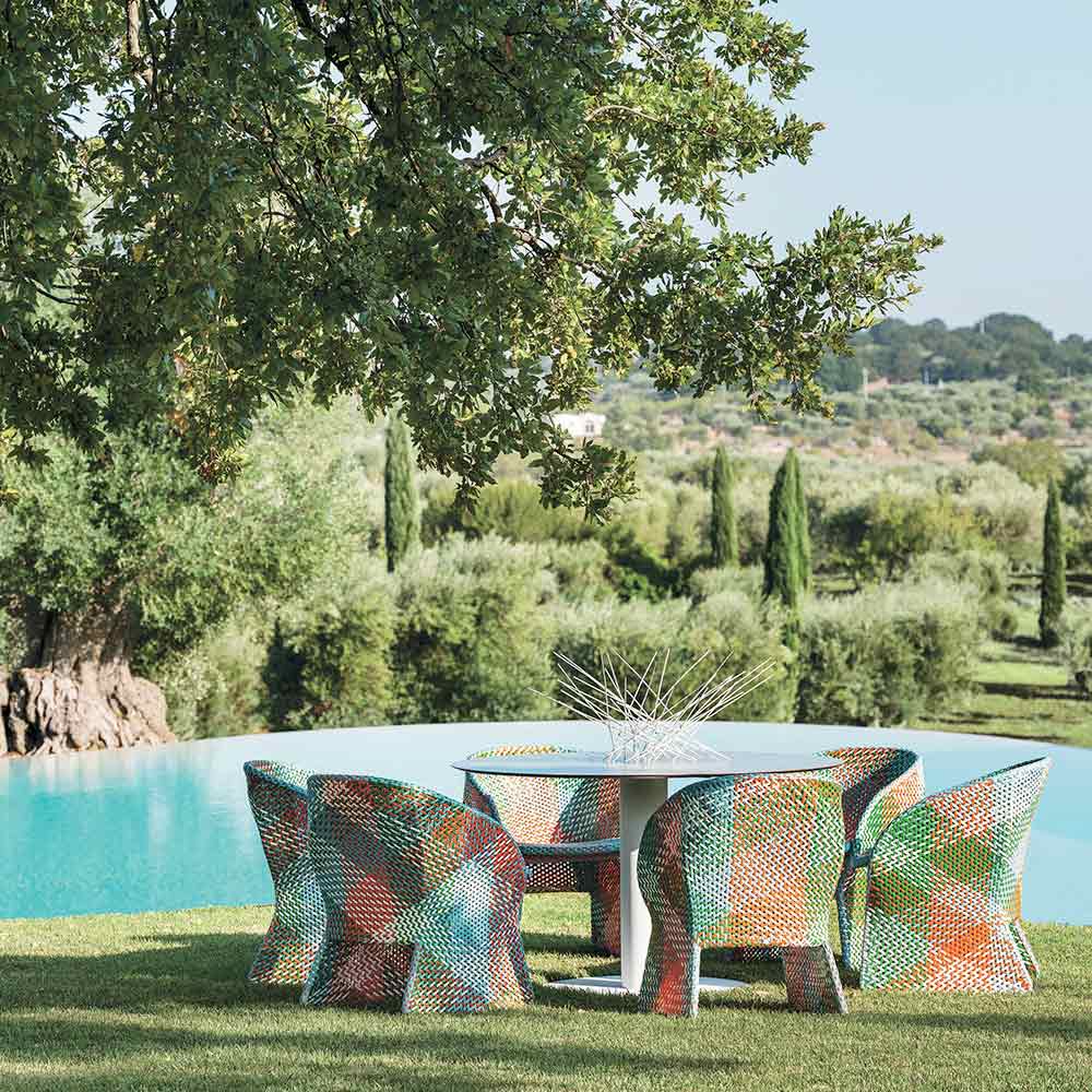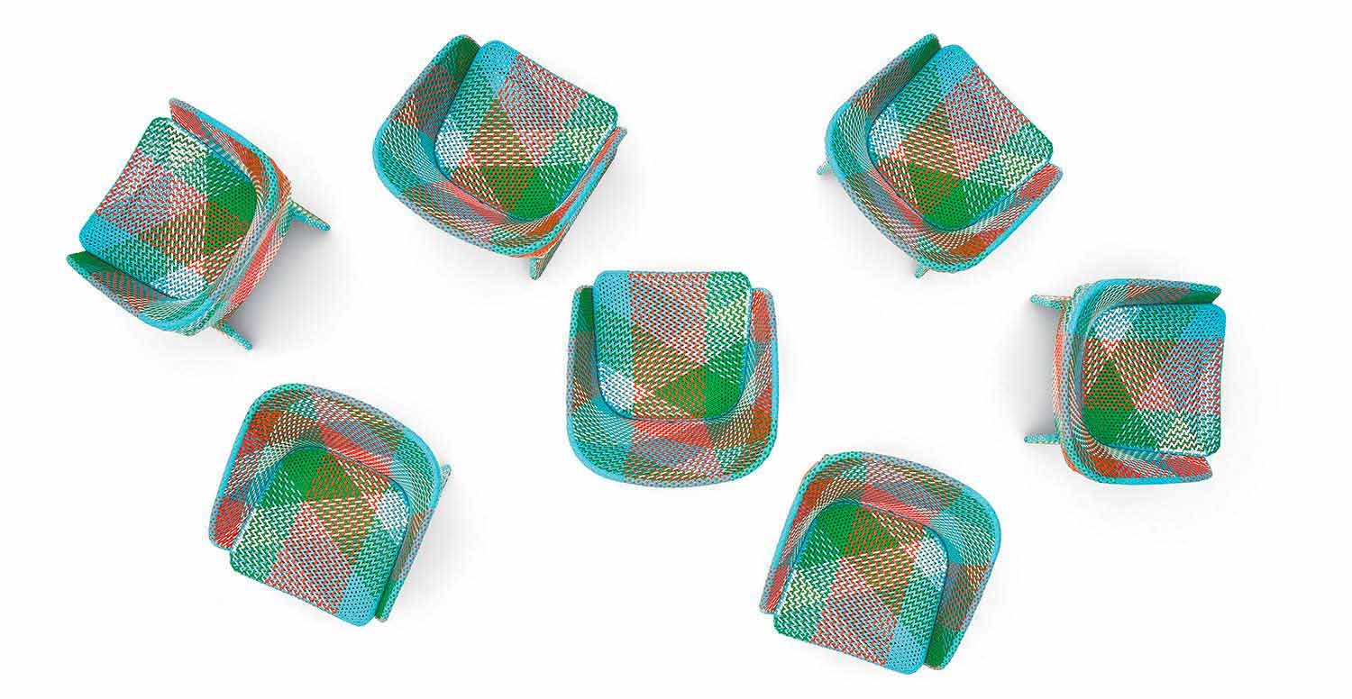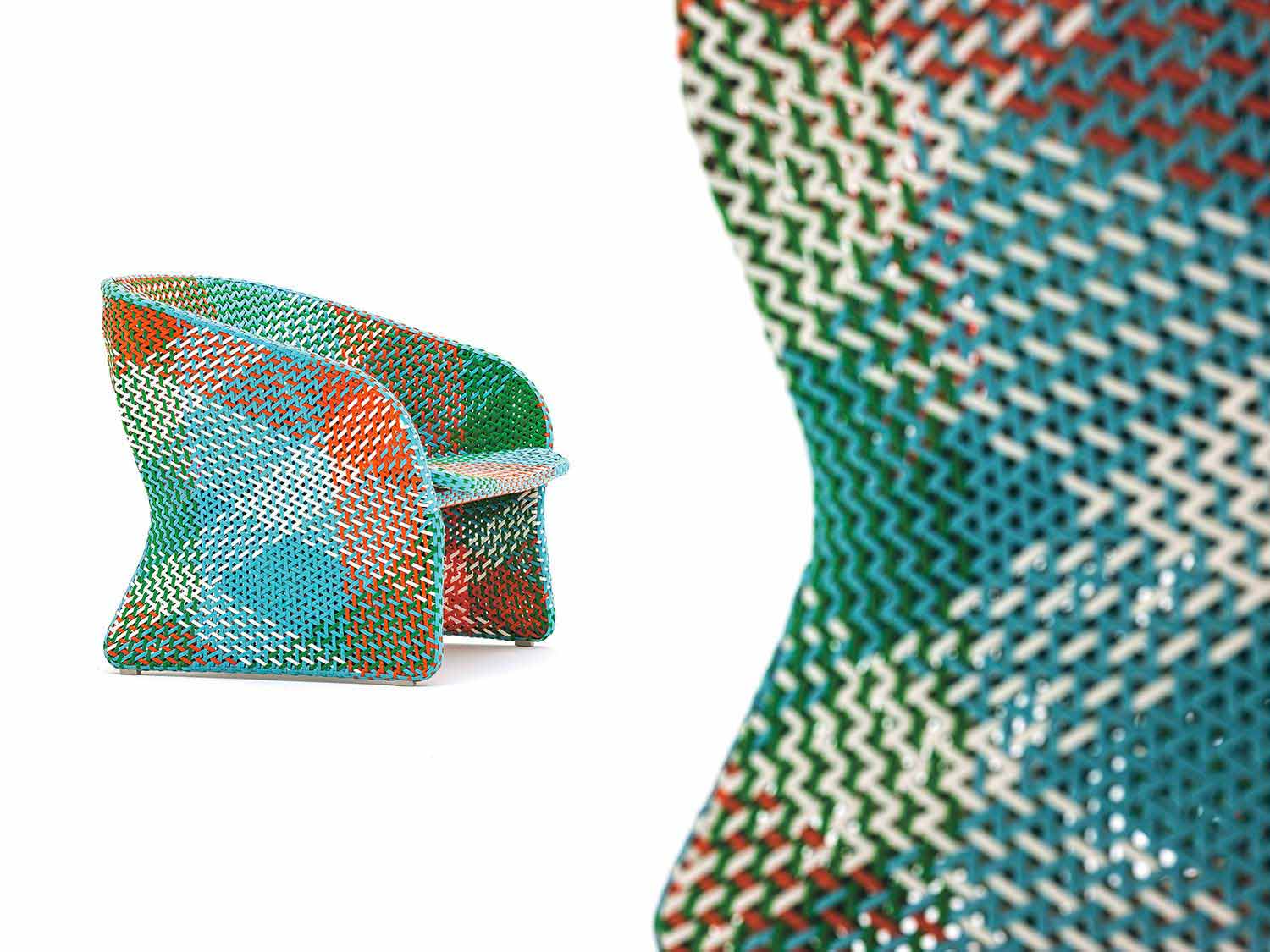 fibra sintetica di colore diverso si incrociano per dare forma all’intreccio della poltroncina Maat. L'intreccio viene