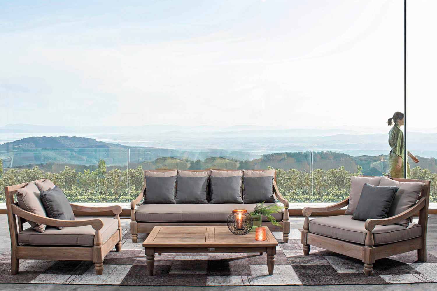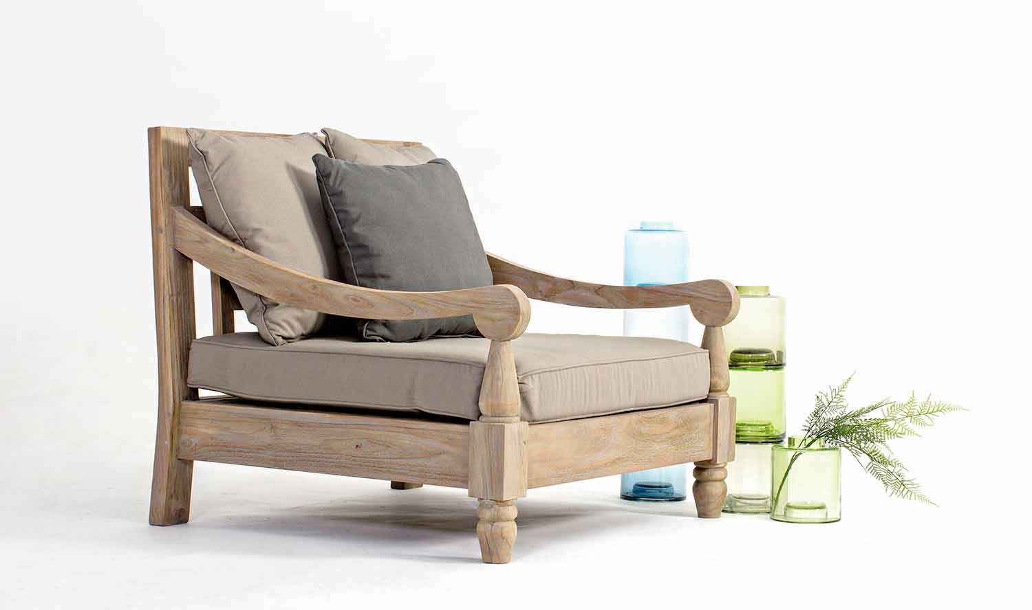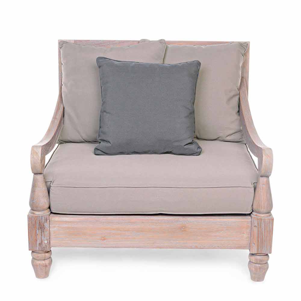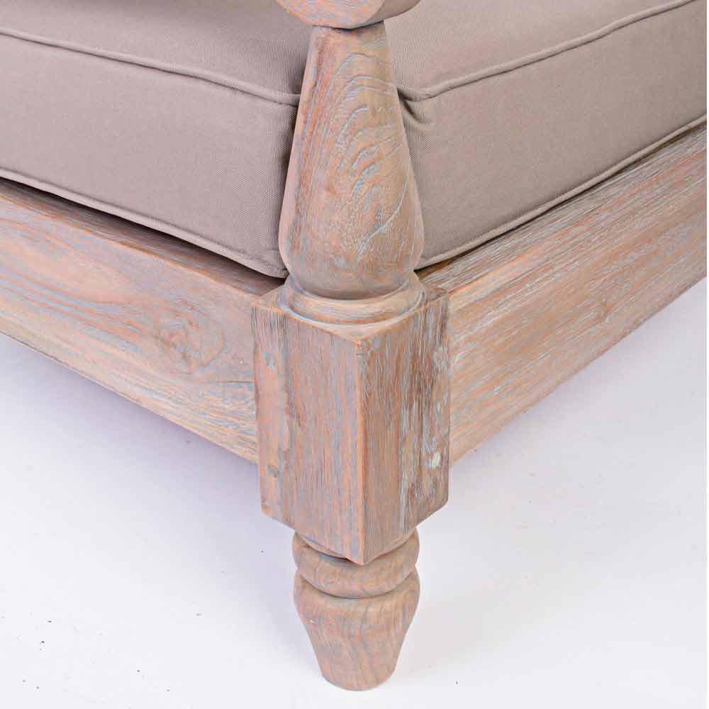 Poltrona da esterno in stile rustico, realizzata in legno teak, con cuscini sfoderabili in tessuto.