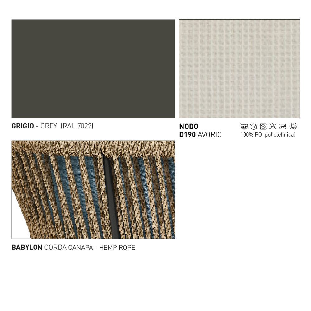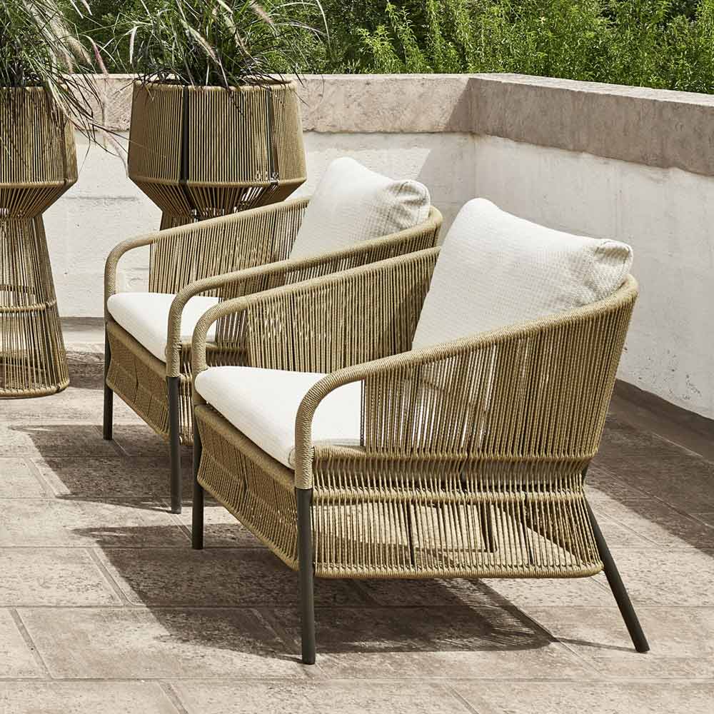 Poltrona da esterno con struttura in alluminio verniciato a polveri finitura grigia, seduta intrecciata a mano in corda color canapa e due cuscini color avorio con imbottitura dryfeel inclusi. Una soluzione d'arredo innovativa e fresca, arricchita dalle meravigliose finiture proposte che trasformano con raffinatezza l'ambiente outdoor.