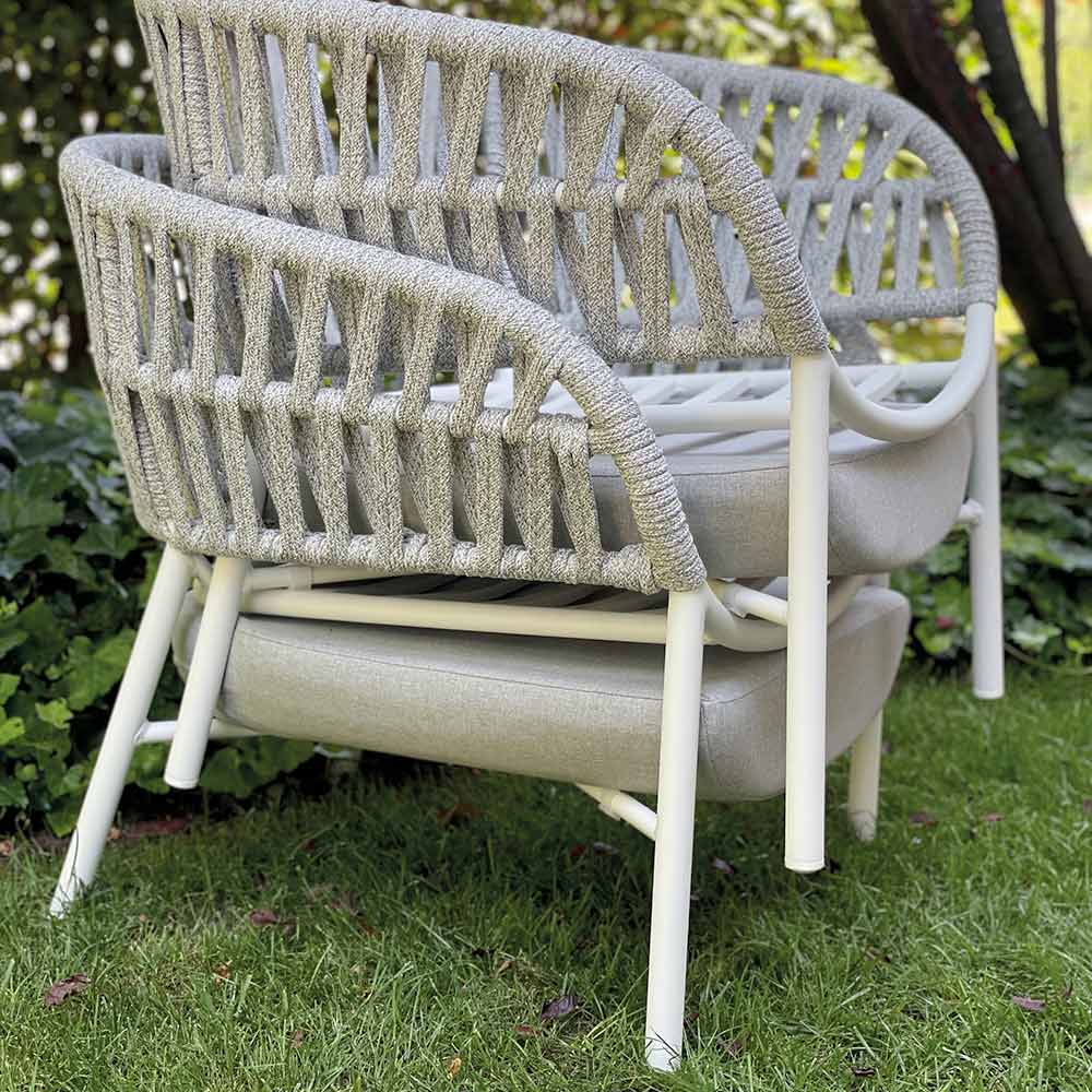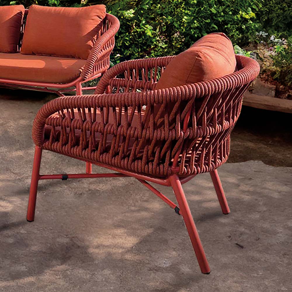 Questa poltrona da giardino è un perfetto esempio di design accogliente e raffinatezza artigianale, ideale per creare un angolo longue all’insegna del relax e dello stile. La struttura in alluminio verniciato, leggera ma resistente, sostiene con eleganza un raffinato intreccio in corda di poliestere, che dona movimento e personalità alla seduta.