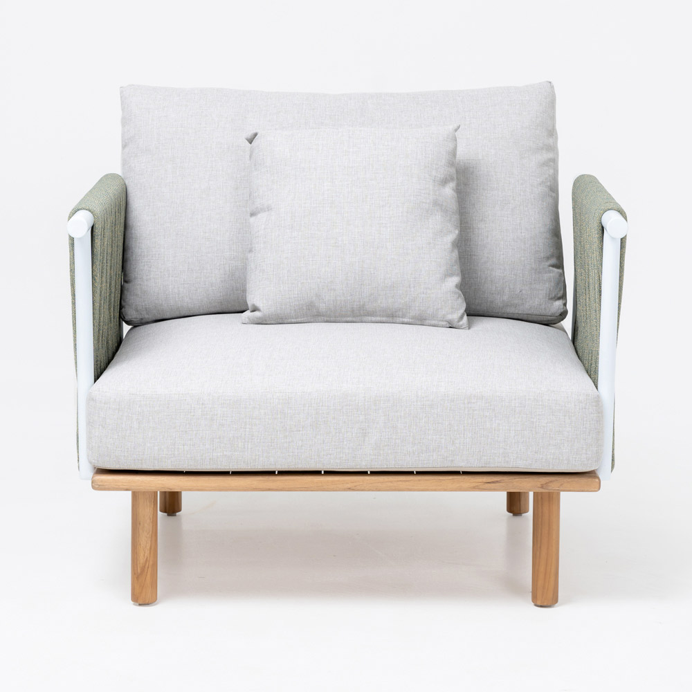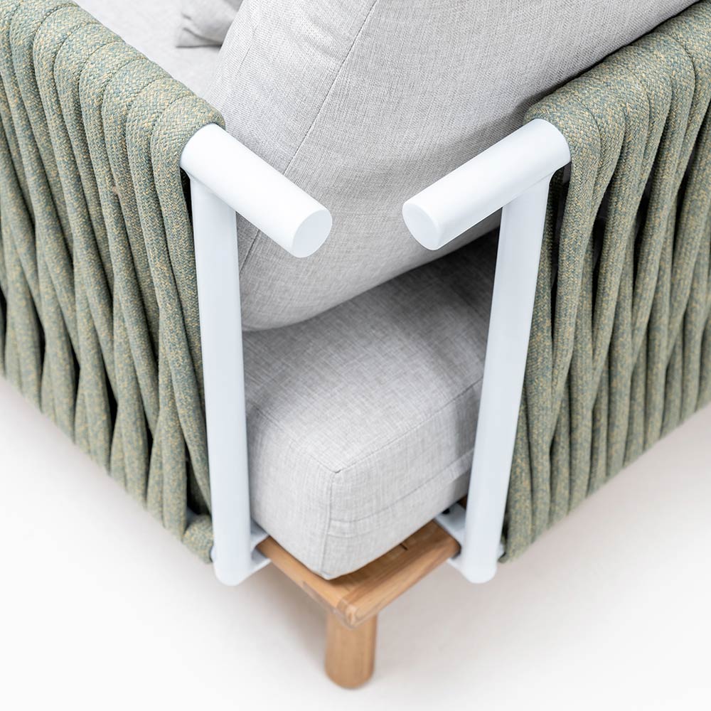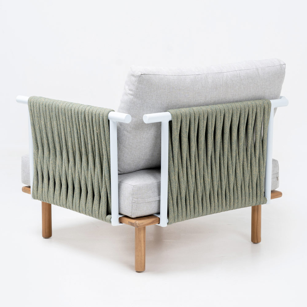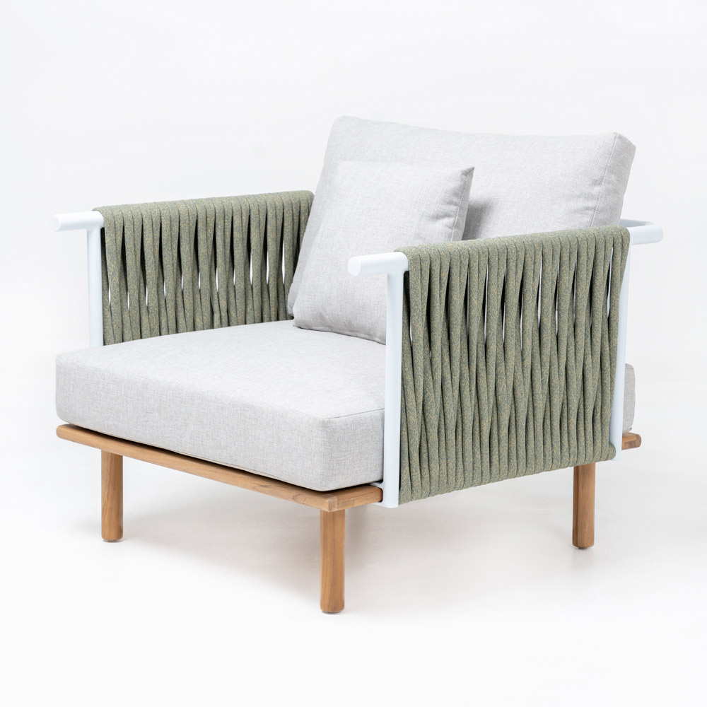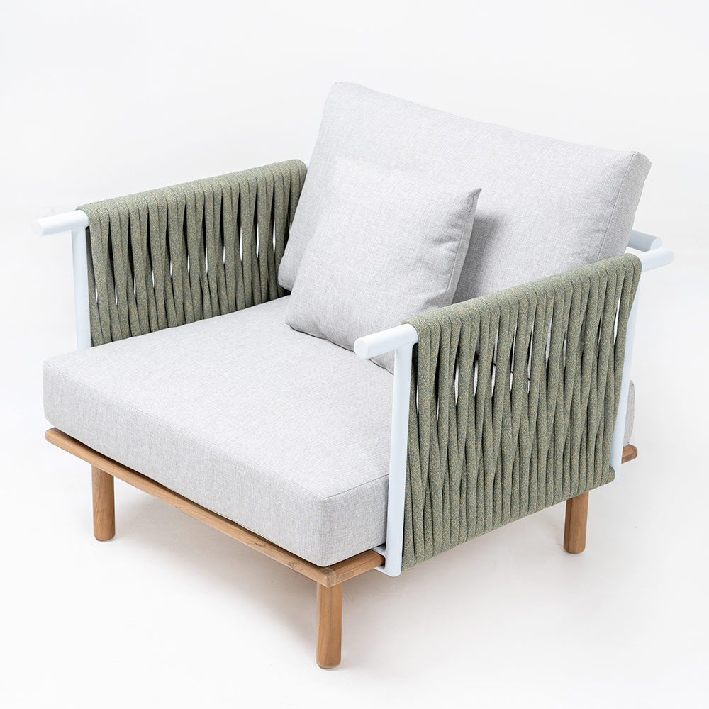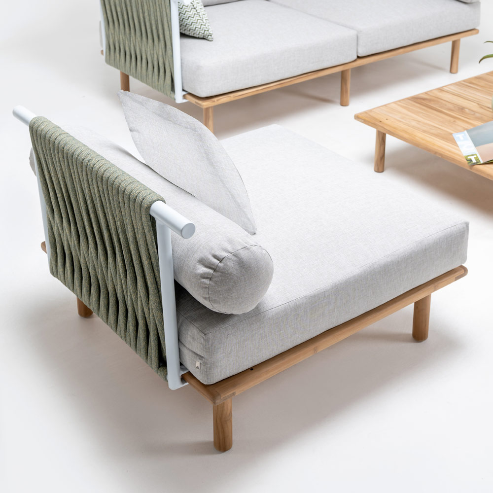 Poltrona da giardino in teak, schienali in alluminio e intreccio in CORDA Olefin/PP e cuscino