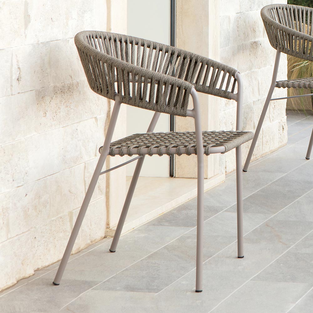 2 Poltrone impilabili per arredamento esterno realizzate artigianalmente in Italia in acciaio zincato color fango con seduta e schienale in corda color fango. La zincatura consente una maggiore resistenza della finitura del materiale agli agenti atmosferici corrosivi come salsedine e acidità delle piogge mentre le corde sono resistenti al cloro e ai raggi solari oltre che antimuffa.