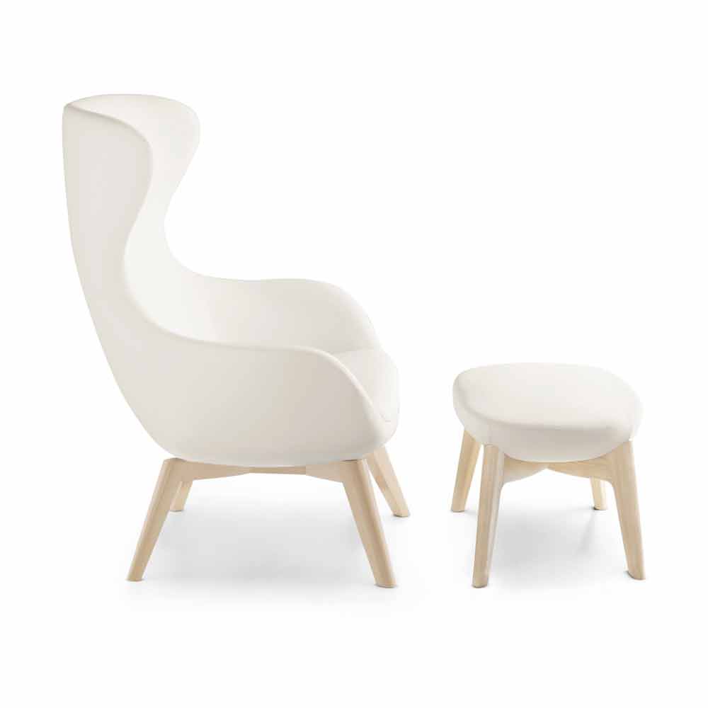 risultato funzionale e ricercato grazie anche alla presenza del pouf, il quale contribuisce a raggiungere una comodità senza eguali. La base in legno completa i due prodotti con un