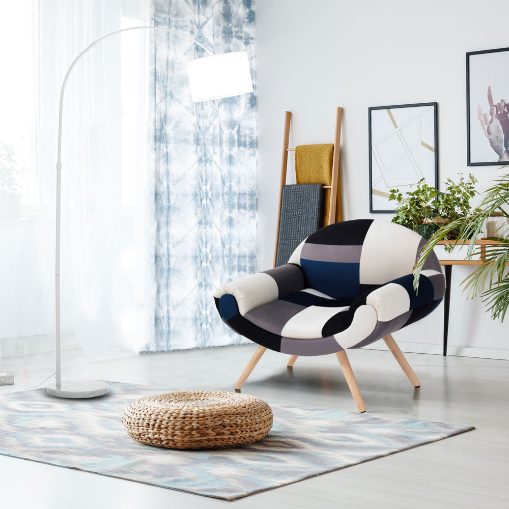rivestita in tessuto con tecnica patchwork non sfoderabile e gambe in