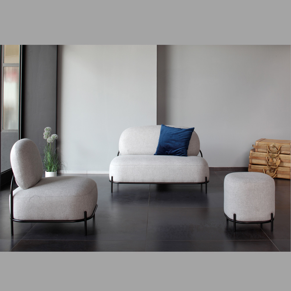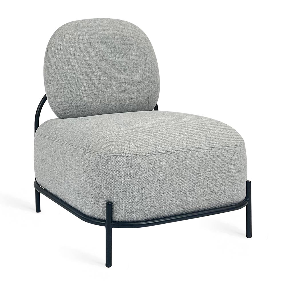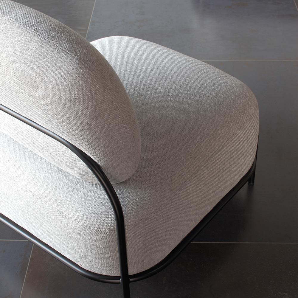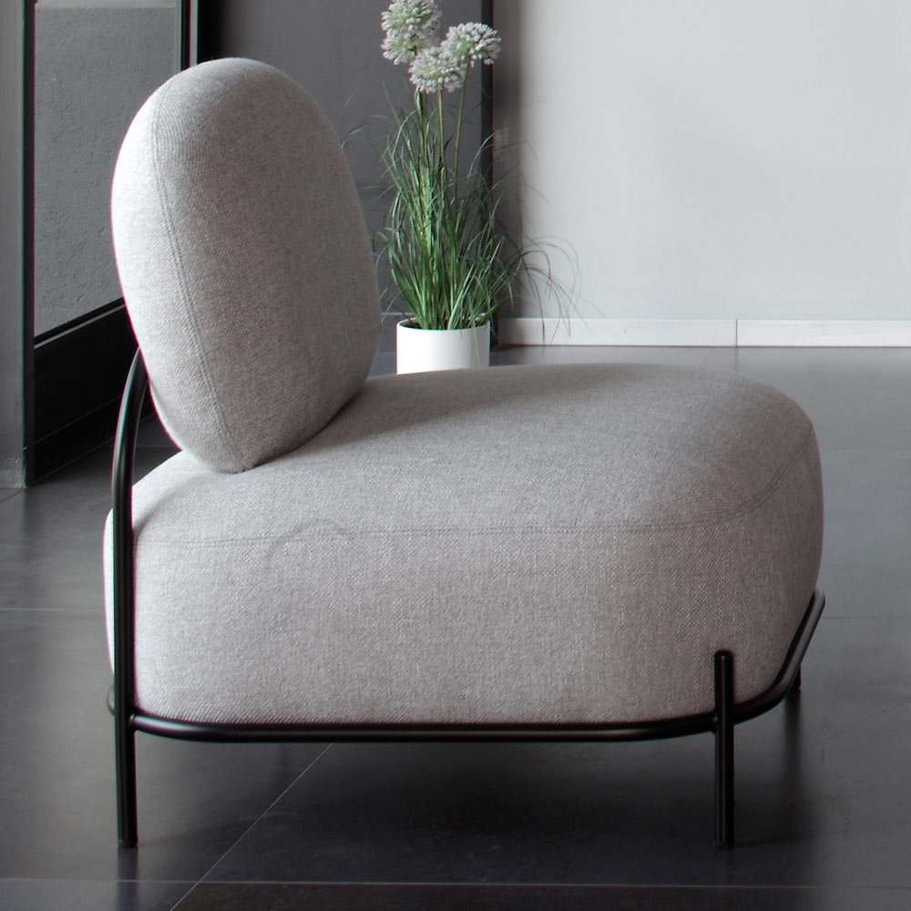 La struttura in metallo verniciato nero conferisce alla poltrona un aspetto solido e grafico, mentre la seduta ampia e lo schienale arrotondato sono rivestiti in tessuto grigio, piacevole al tatto e resistente all’uso quotidiano. Il contrasto tra la linea sottile della struttura e la morbidezza delle imbottiture crea un equilibrio visivo sofisticato e accogliente.