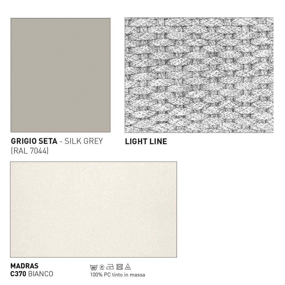 - gamba grigio seta, intreccio light line e cuscino seduta madras bianco;