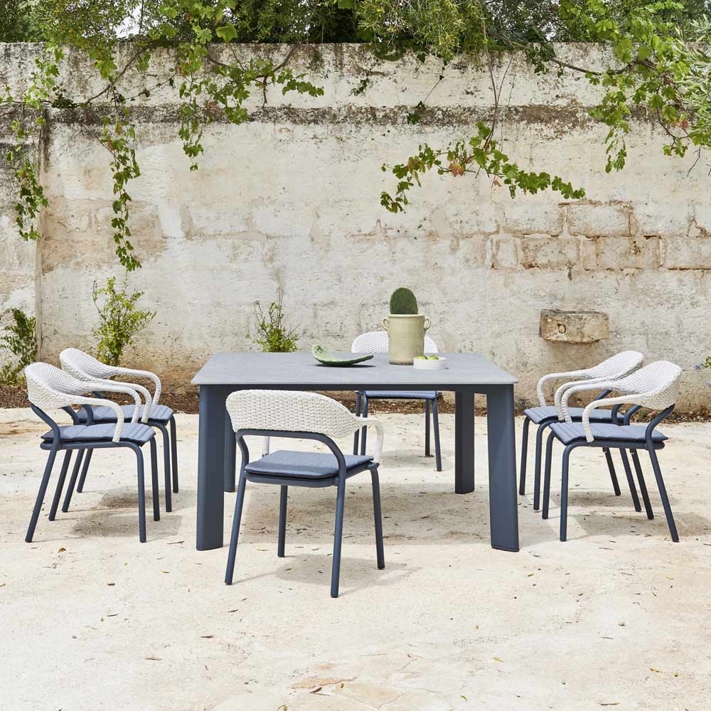 Poltroncina da giardino impilabile in alluminio verniciato con cuscino seduta Made in Italy.