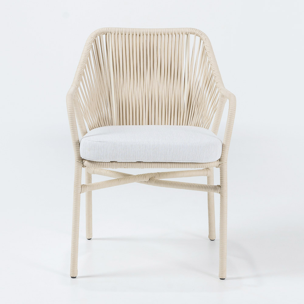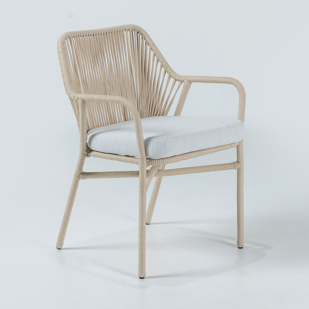Poltrona da esterno realizzata con struttura in alluminio, intreccio in CORDA Olefin/PP e cuscino seduta in olefin colore di serie "off white".