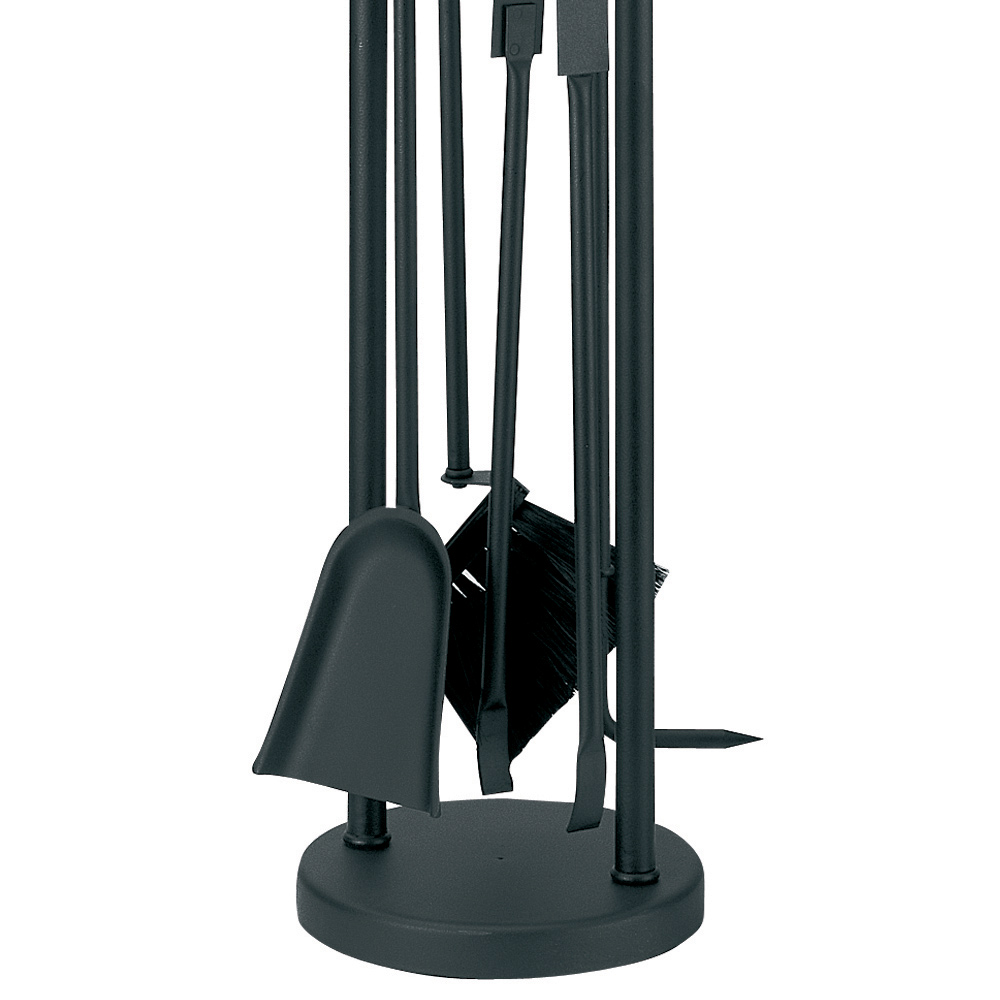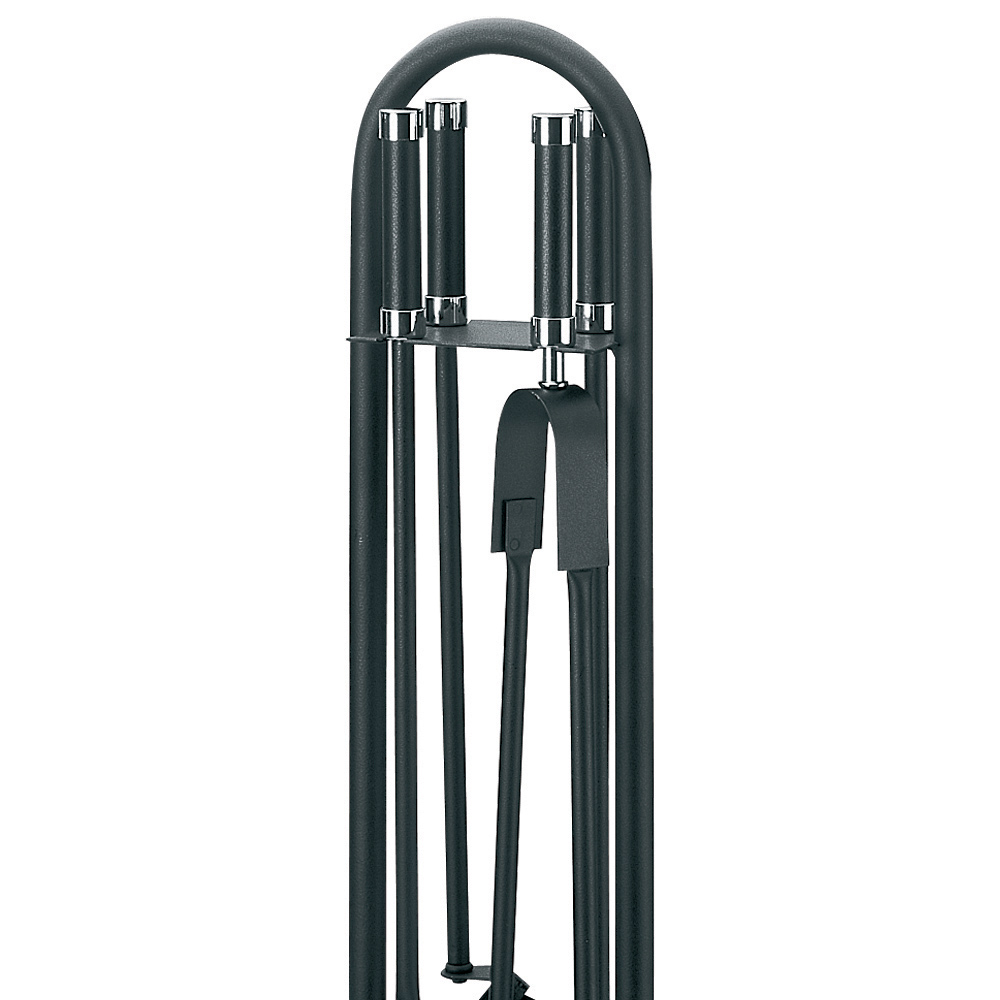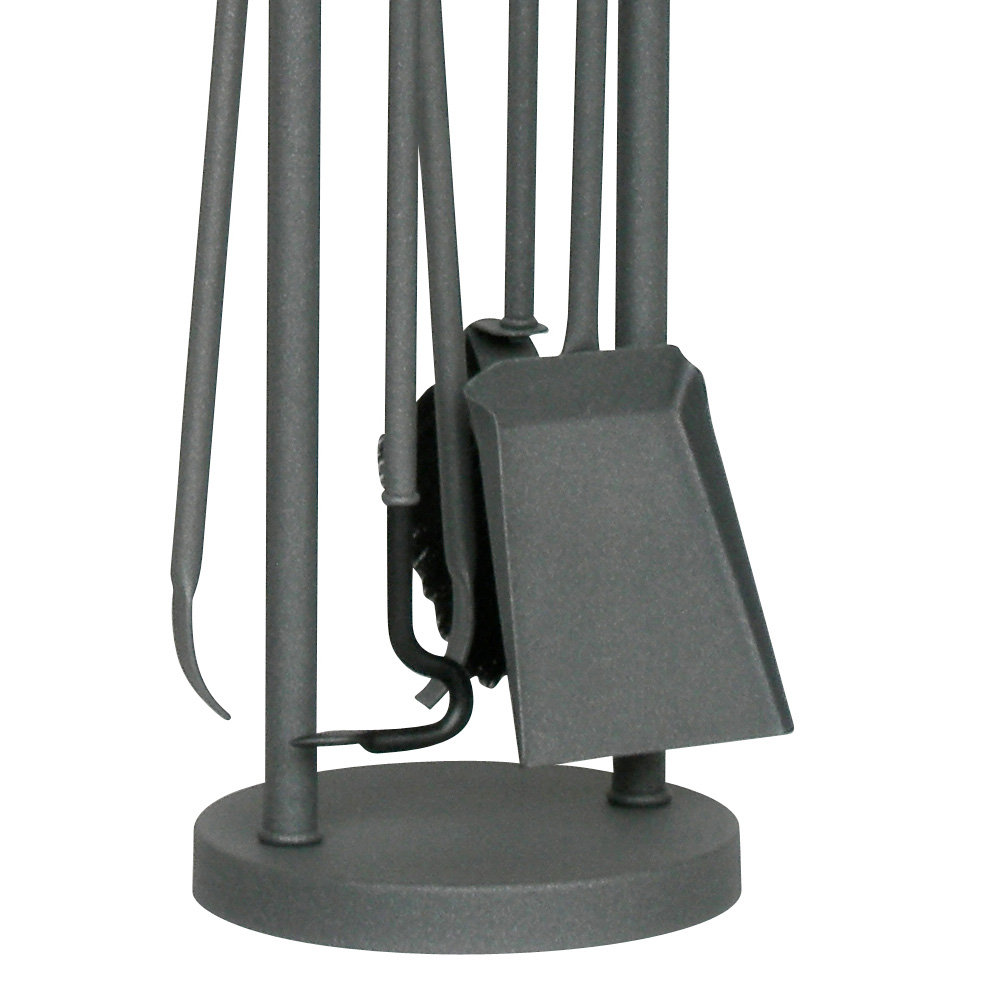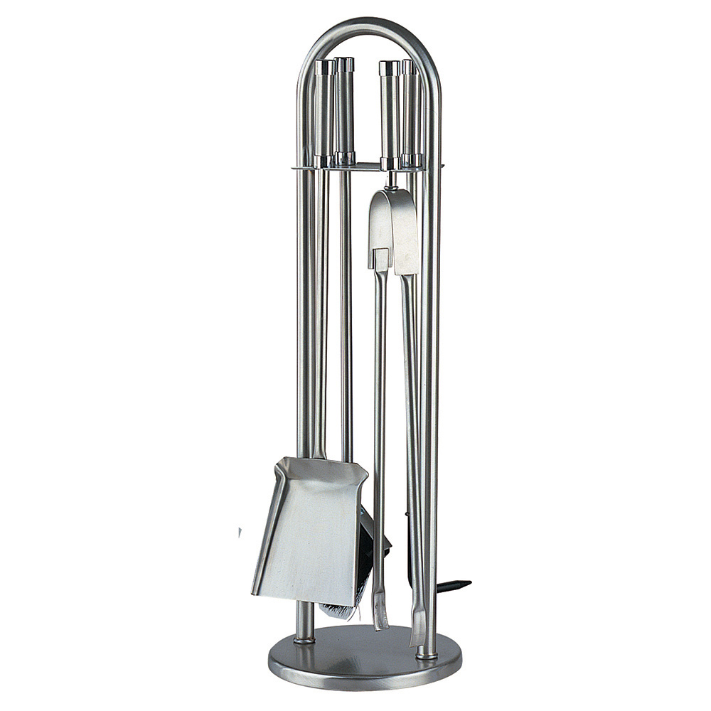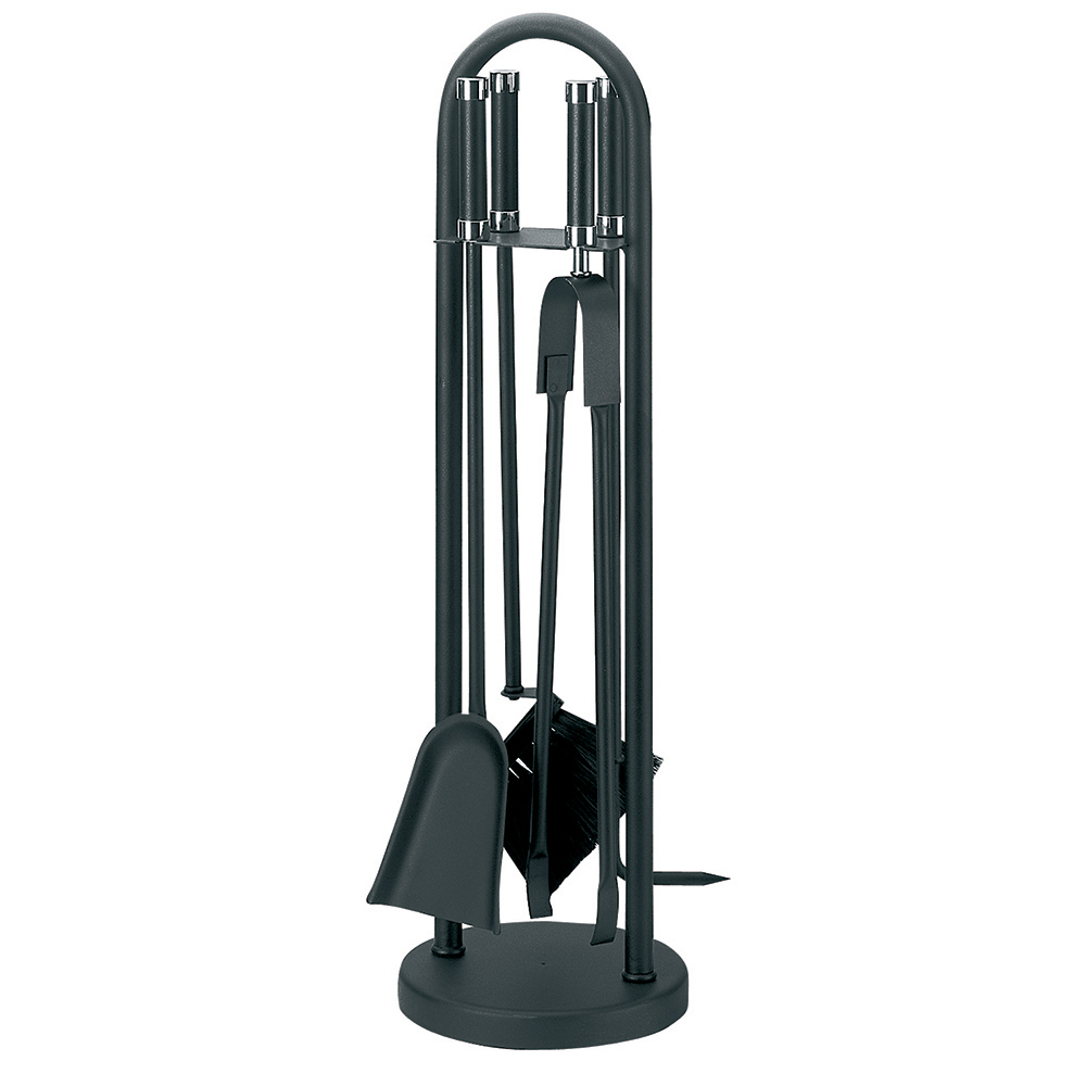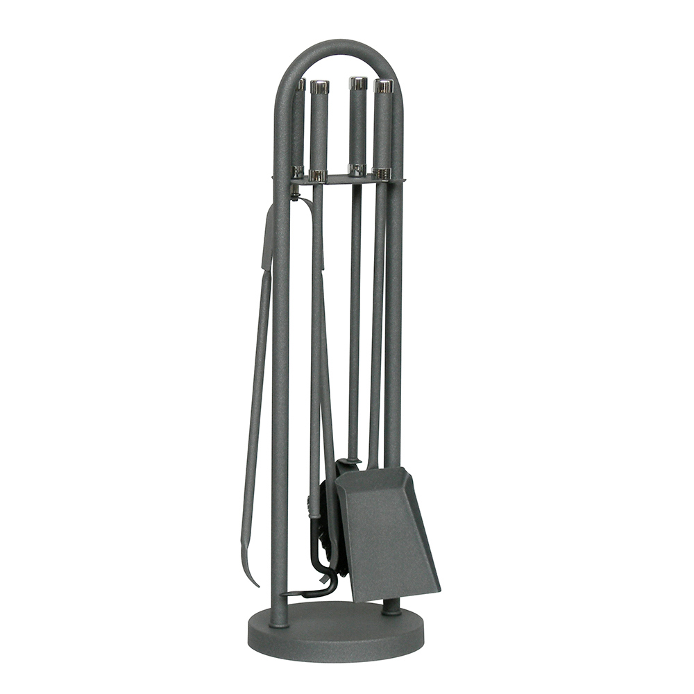 Il set include quattro strumenti fondamentali per la cura del vostro focolare, ciascuno con manici lunghi per una gestione sicura del fuoco. Gli attrezzi sono elegantemente sospesi su supporti, rendendo il set non solo pratico ma anche una parte integrante del vostro arredo.