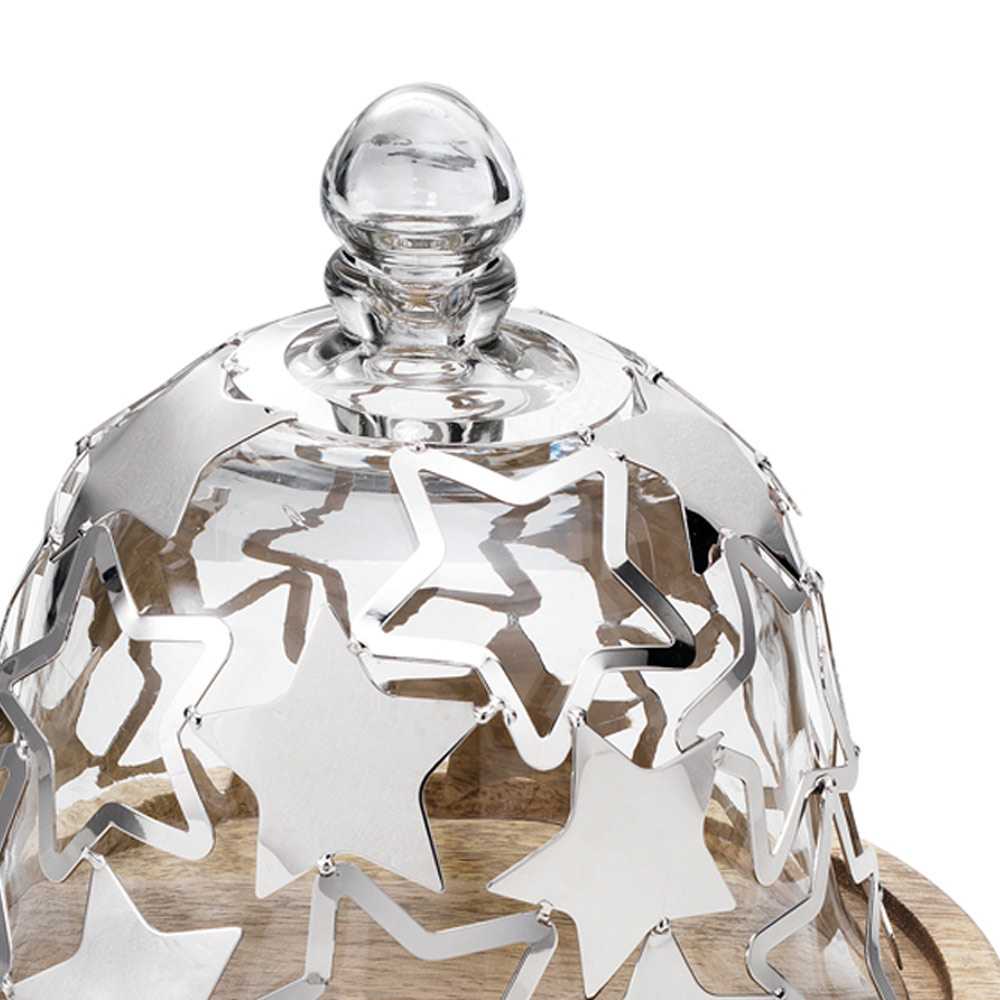 Questo porta torte presenta un design a campana sofisticato ed elegante, interamente realizzato con base in legno e coperchio in vetro con decori in metallo argentato a forma di stella.