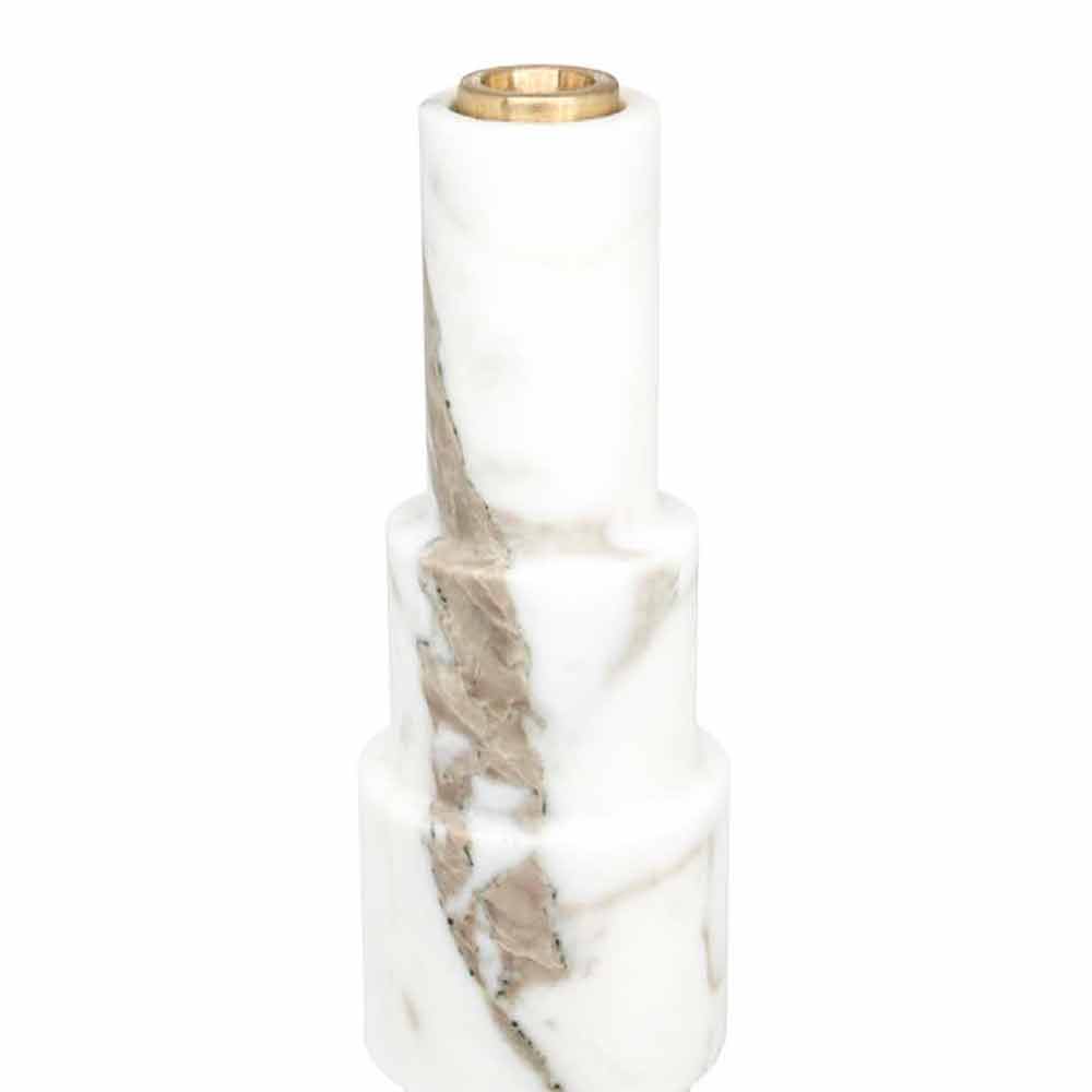 Portacandele alto moderno in marmo bianco di Carrara e ottone Made in Italy.