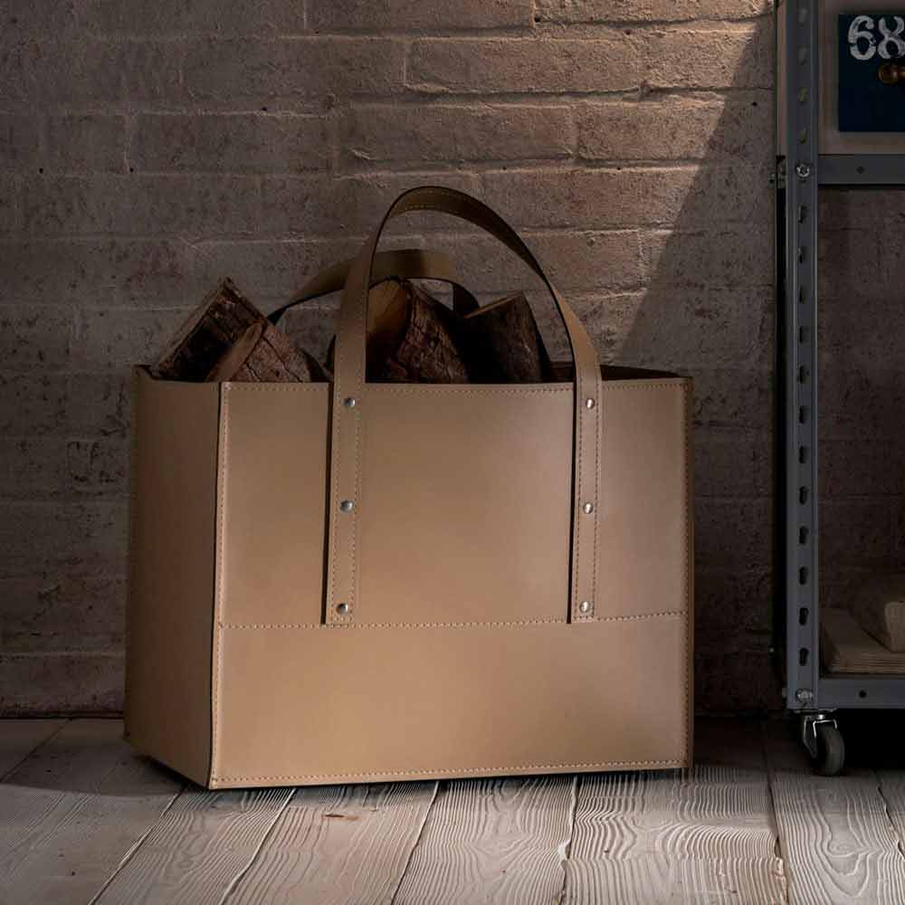 Contenitore portalegna di design in cuoio Maneghe, made in Italy