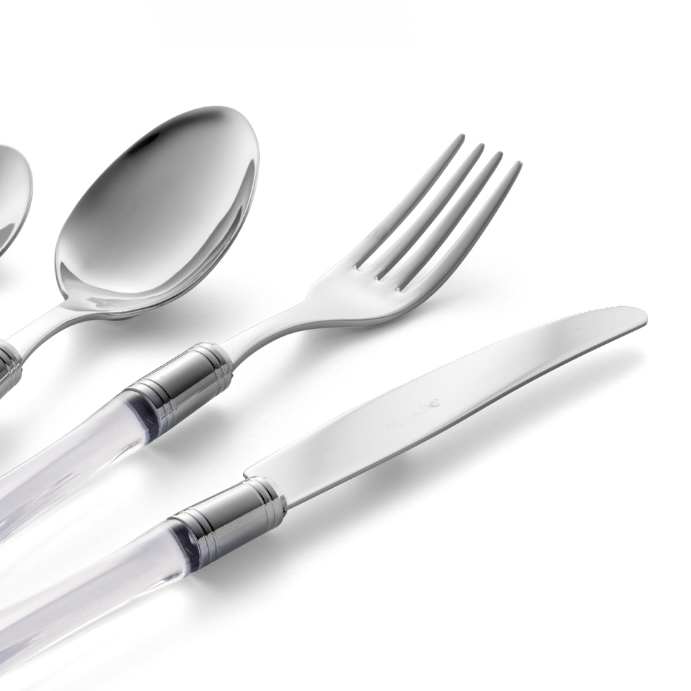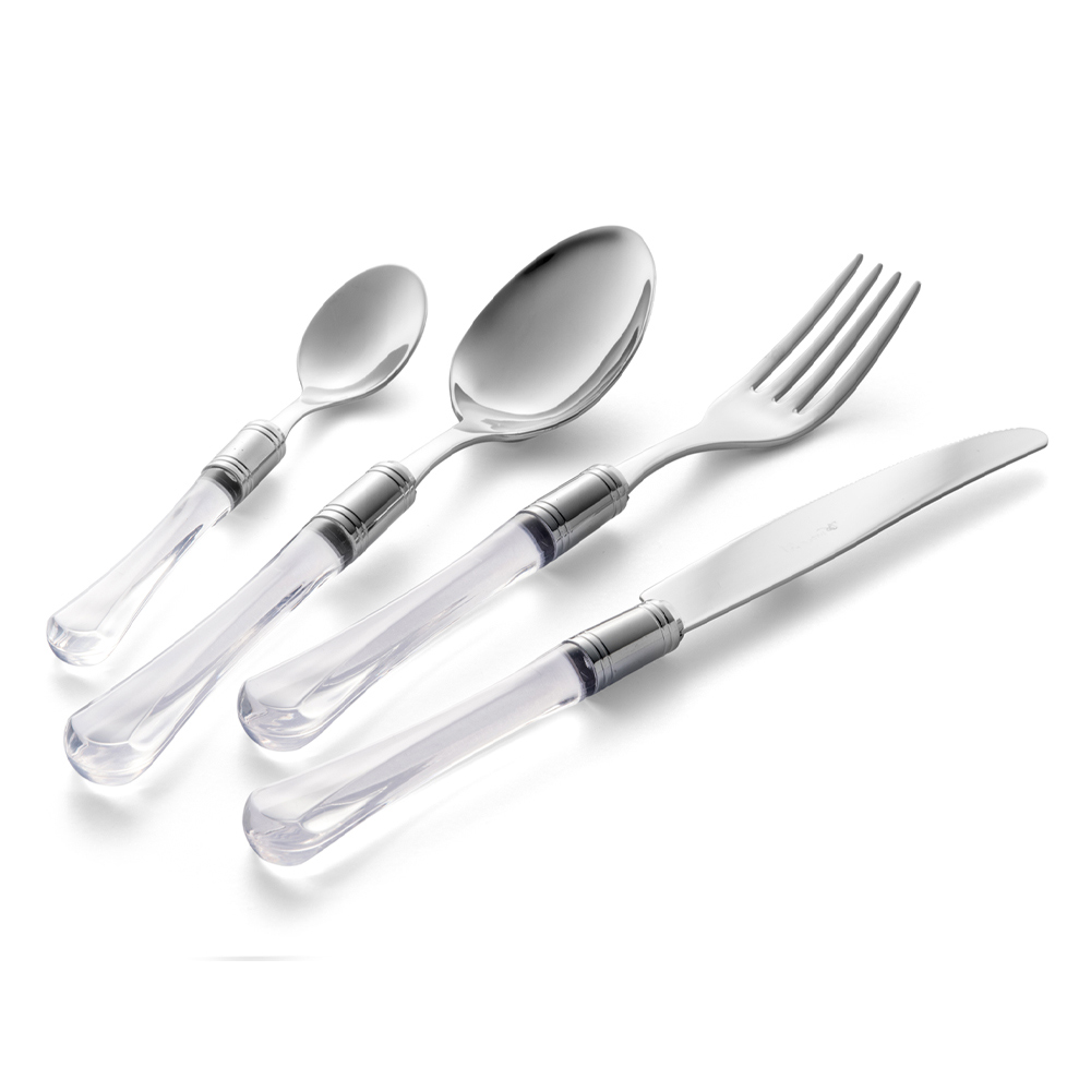 Servizio posate in acciaio inox e manico in plastica trasparente 24 pezzi made in Italy.