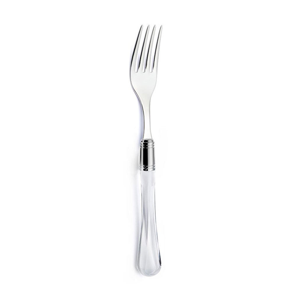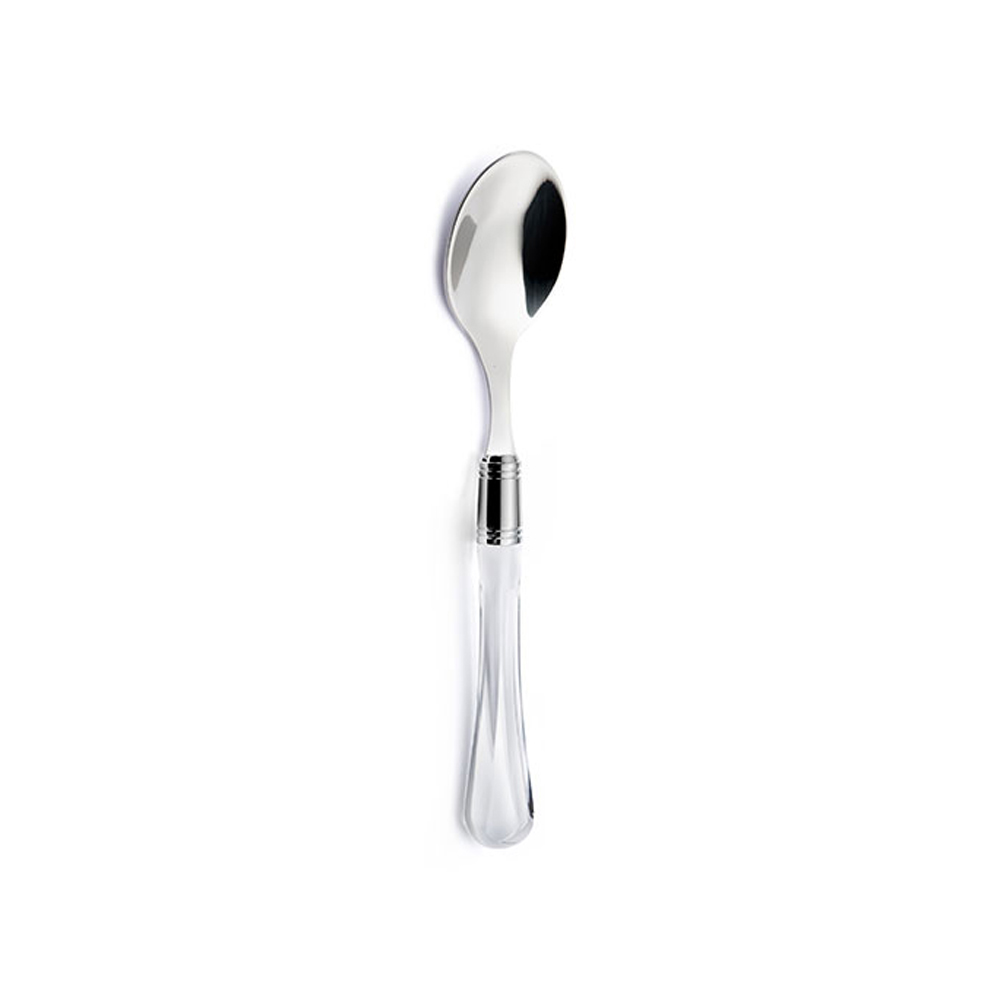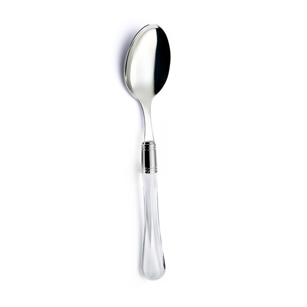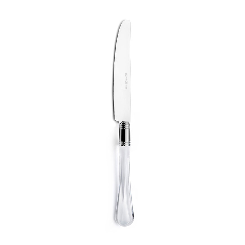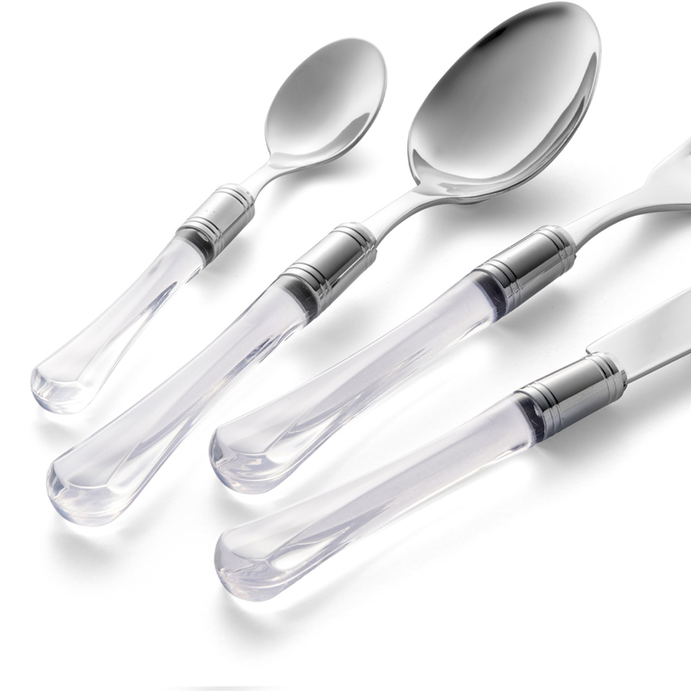 ghiera cromata svolge un duplice ruolo: non solo nasconde l'innesto d'acciaio nel manico trasparente, ma rendere importante la posata come un vero gioiello.