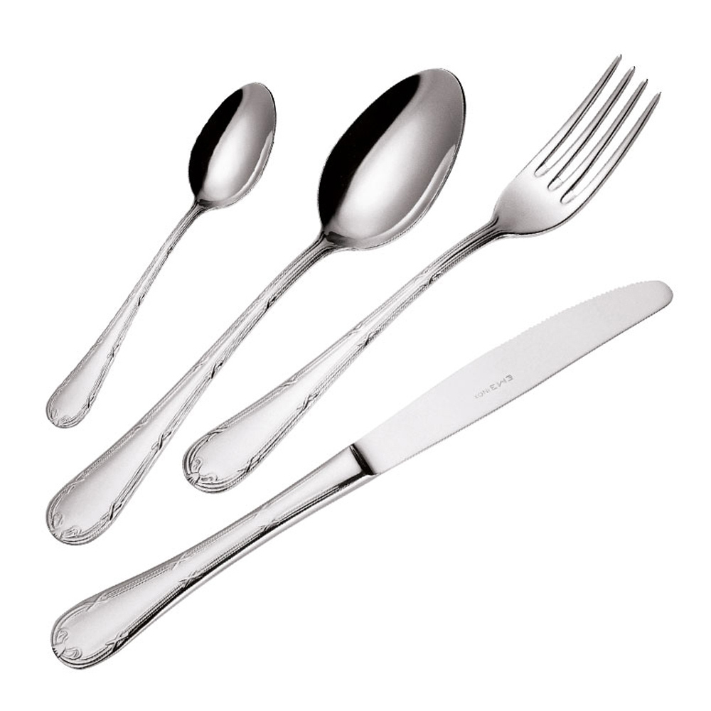 Servizio completo di posate in acciaio inox lucido design classico con decori, 24 pezzi made in Italy.