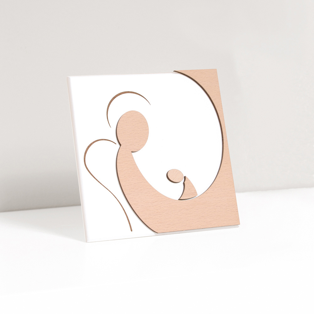 Quadretto sacro con mamma e bambino in legno naturale applicati. Pannello in legno laccato bianco con piedino d'appoggio e foro per appenerlo a parete.