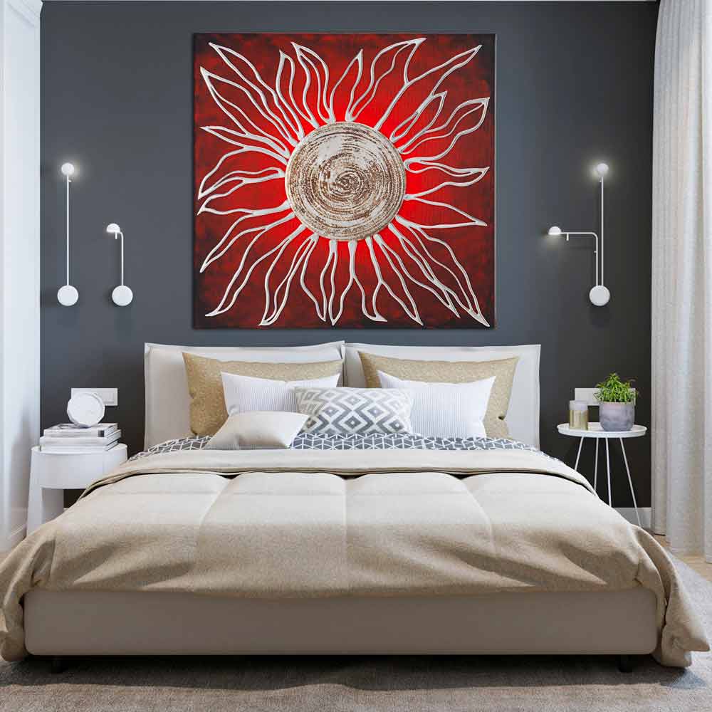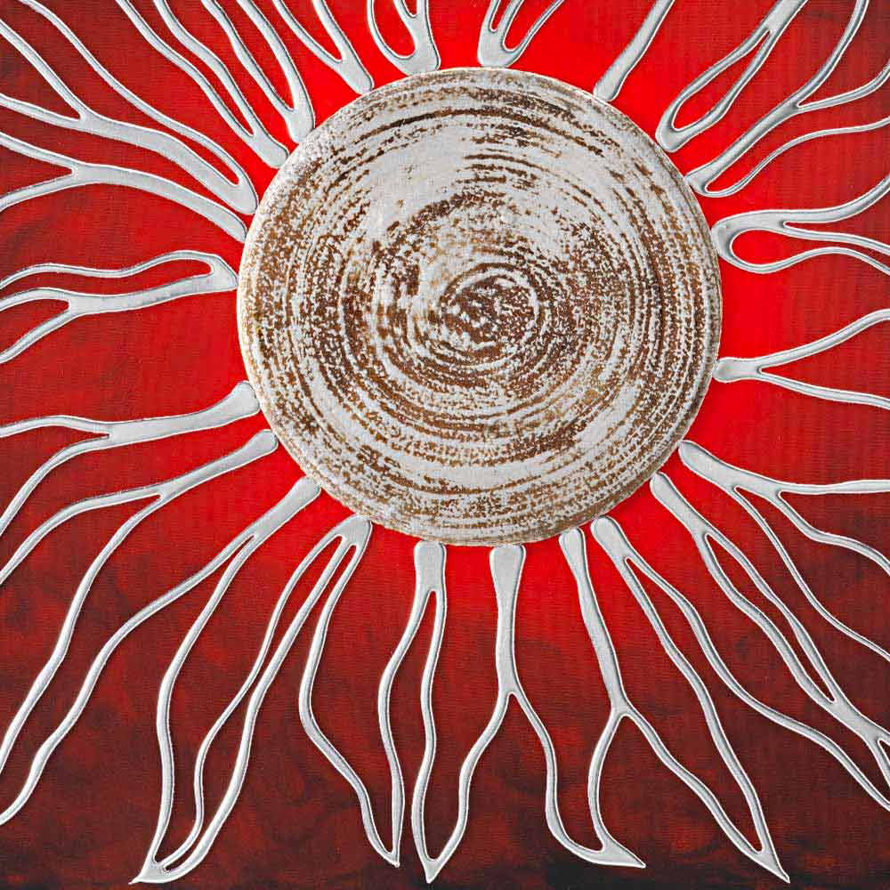 Struttura telata decorata a mano con fondo rosso e lavorazione materica in rilievo, elemento centrale e raggi in foglia argento.