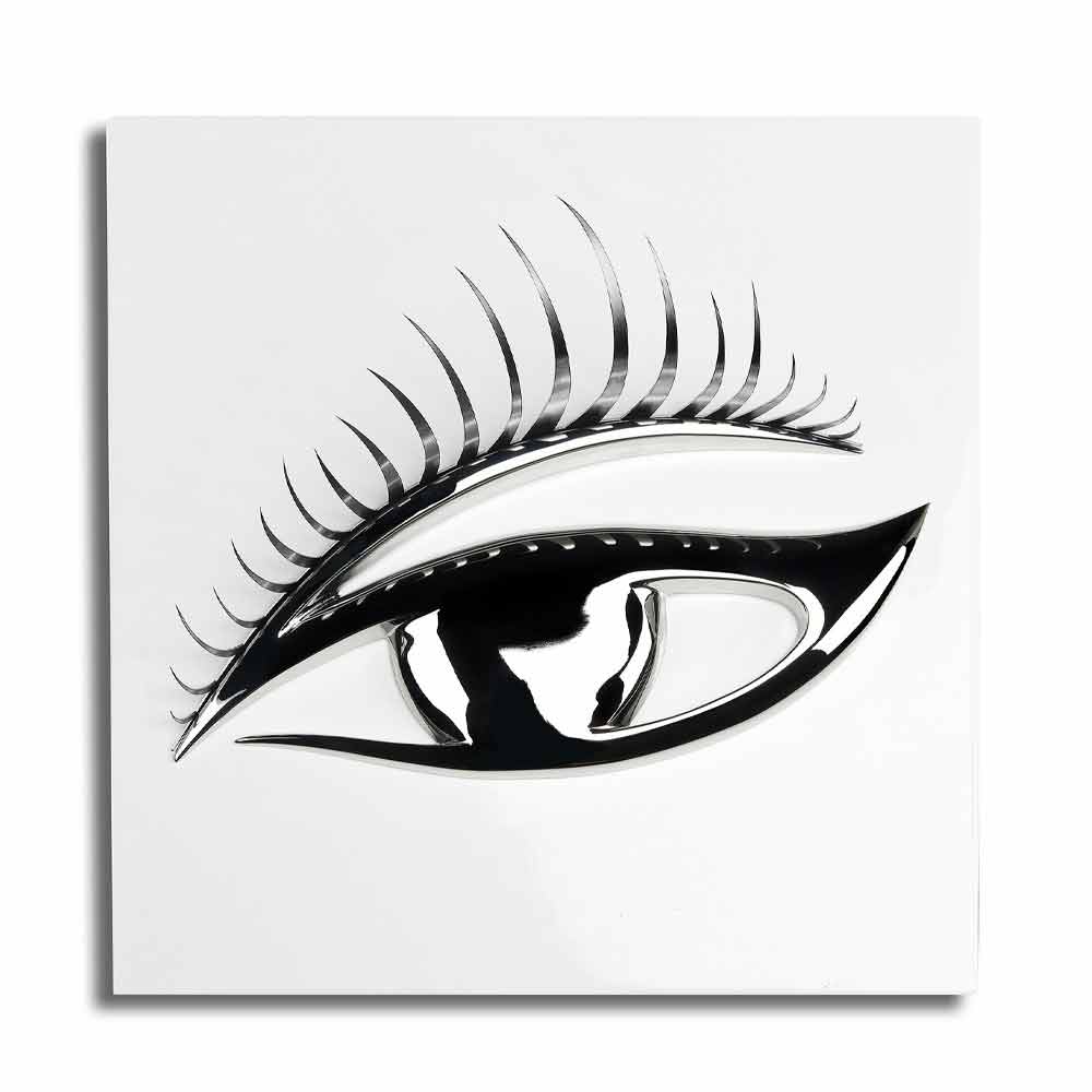 Pannello decorativo da parete realizzato artigianalmente in Italia in legno laccato con ciglia in acciaio e occhio in resina finitura cromata. L'eleganza del design incontra la ricercatezza dei materiali per dare vita ad un complemento originale che possa arricchire le proprie pareti di casa in maniera esclusiva e con una