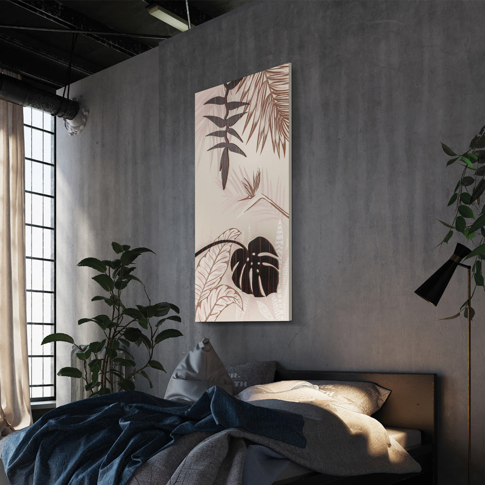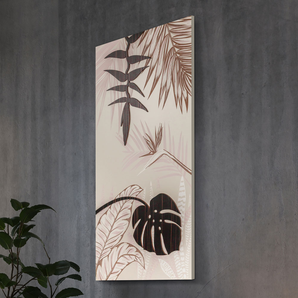 Il pannello da decoro è realizzato utilizzando la tecnica della marcatura laser che crea un bassorilievo sul materiale, creando diverse gradazioni di colore delle foglie realizzate sul pannello. Il quadro è realizzato in legno laccato sabbia opaco con applicazioni in legno di ebano. Gli altri colori presenti sul pannello, come rosa, marrone sono dati dalla marcatura laser.