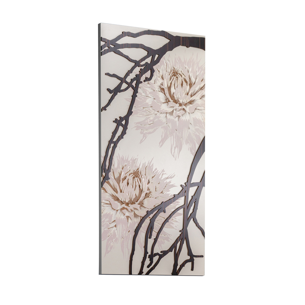 Il pannello da decoro è realizzato utilizzando la tecnica della marcatura laser che crea un bassorilievo sul materiale, creando diverse gradazioni di colore del fiore, appunto la Dalia. Il quadro è realizzato in legno laccato sabbia opaco con applicazioni in legno di ebano. Il colore rosa delle dalie è dato dalla tecnica della marcatura laser.