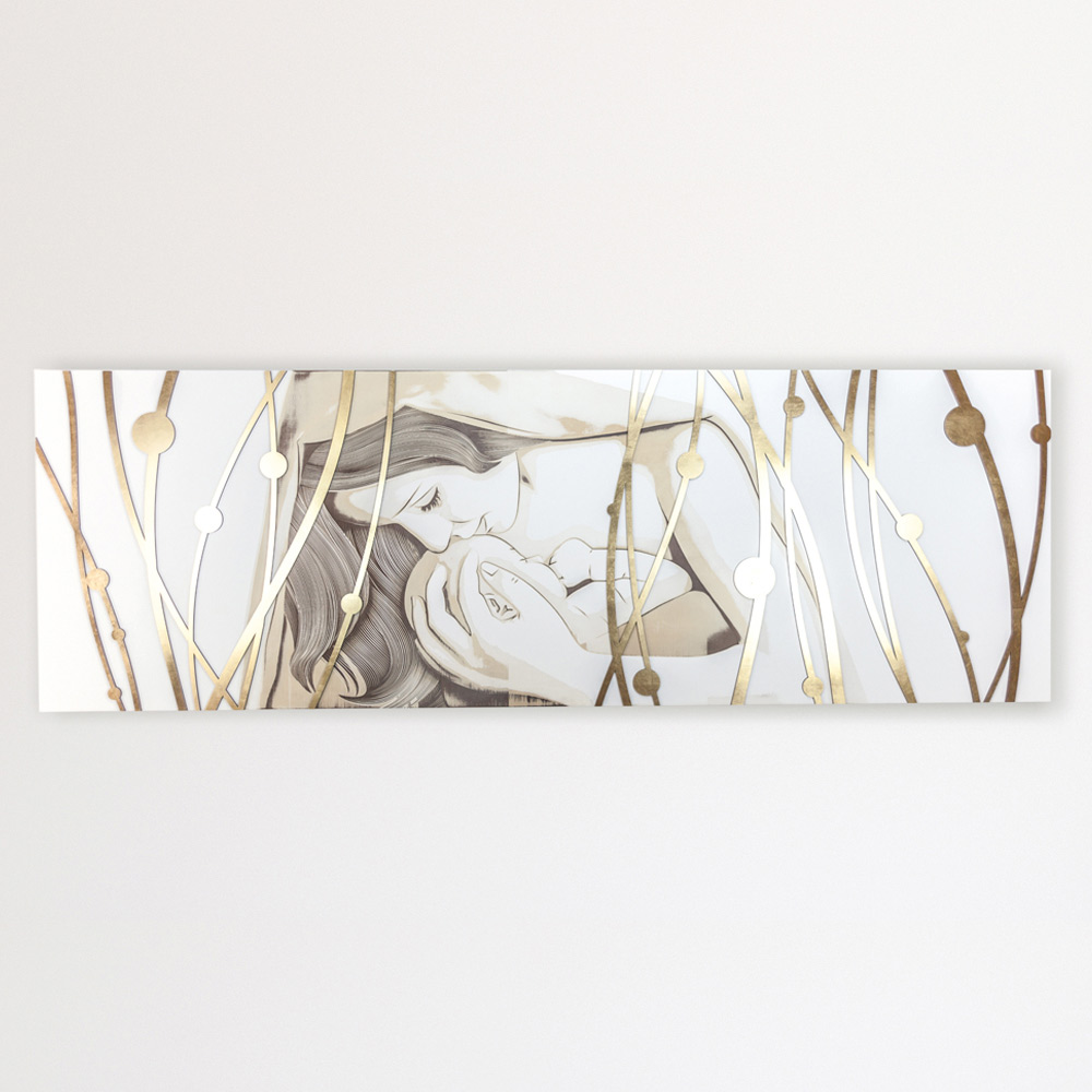 Il pannello da decoro è realizzato utilizzando la tecnica della marcatura laser. Quest'ultima si può vedere nei tratti della madre e del bambino e nella folta chioma che incornicia i due volti. Pannello in