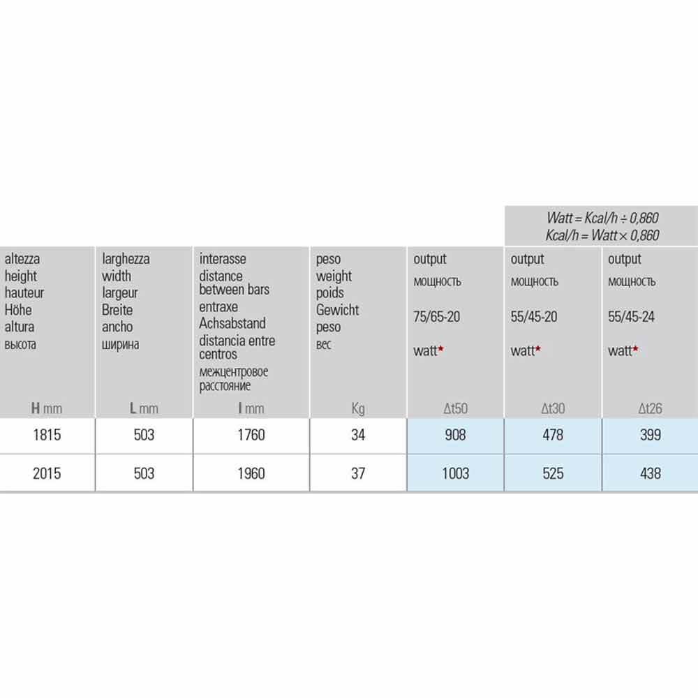 - H 1815 x L 503 x Inter.1760 mm x Resa w(Δt50*) 908; Resa w(Δt30*) 478; Resa w(Δt26*) 399