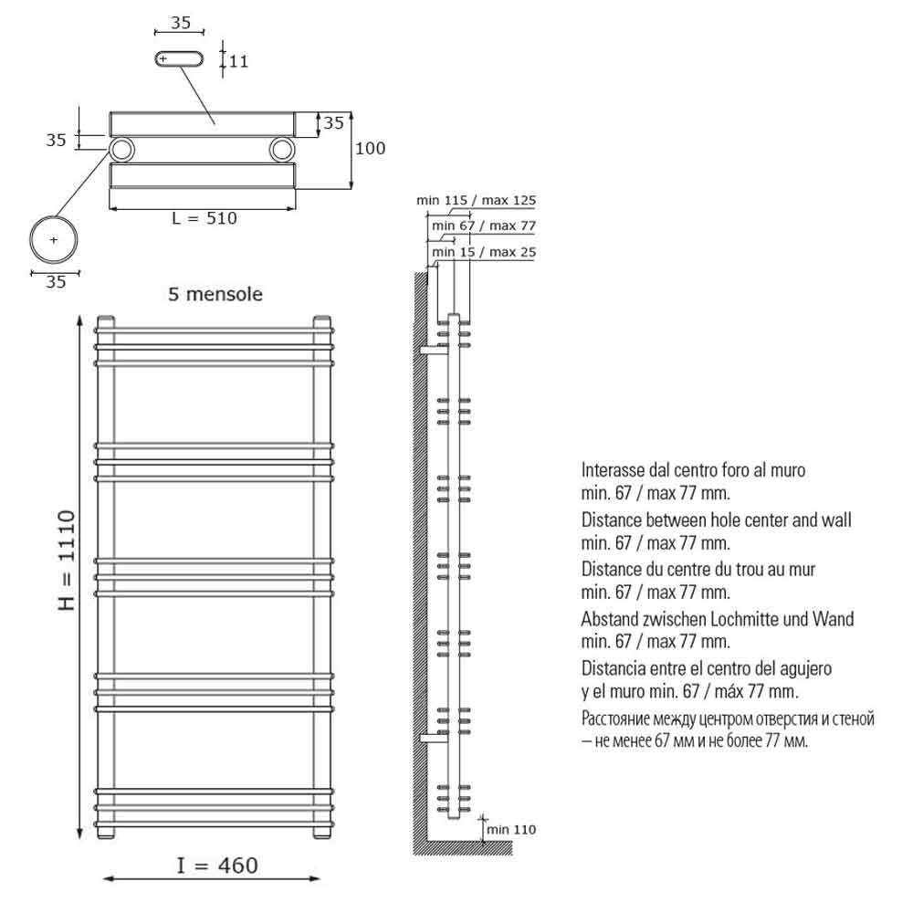 - H 1110 x L 510 x P 35 x Inter.460 mm x Resa w(Δt50*) 530; Resa w(Δt30*) 290; Resa w(Δt26*) 240.