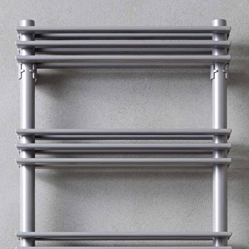radiatore idraulico presenta un design multifunzionale composto da tubi verticali e piastre orizzontali che possono svolgere la funzione di vere e proprie mensole.