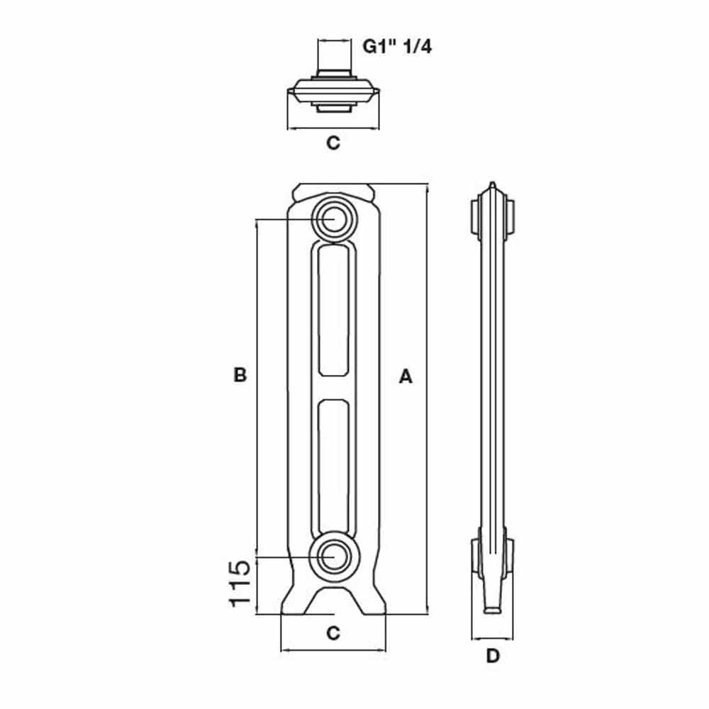 Sono disponibili altre varianti misura realizzate attraverso un assemblamento in batterie da 3 a massimo 16 elementi, a scelta tra 2 o 3 colonne decorate. Include i piedini lateriali e verniciatura antiruggine di fondo a immersione.