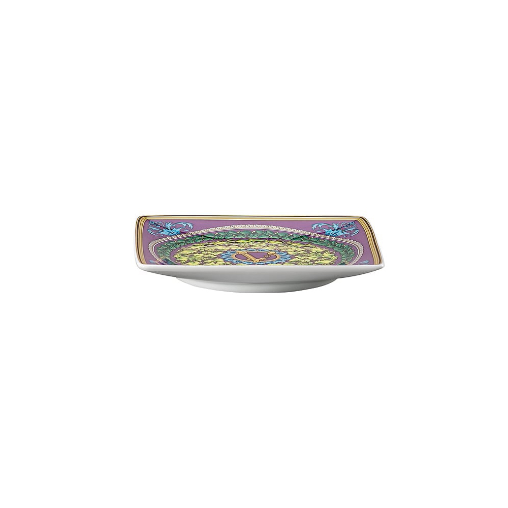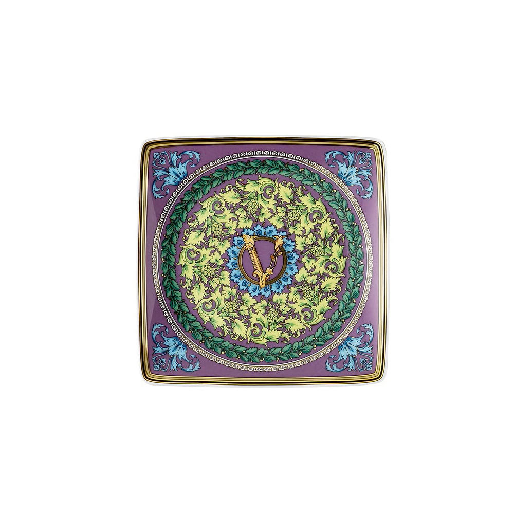 La coppetta Barocco Mosaic di Versace, in pregiata porcellana, è una straordinaria celebrazione di arte e lusso italiano. Il suo design accattivante presenta un intricato mosaico barocco, arricchito da vivaci tonalità di viola, verde e blu che si intrecciano armoniosamente attorno al simbolo centrale della "V" Versace, emblema di eleganza e raffinatezza.
