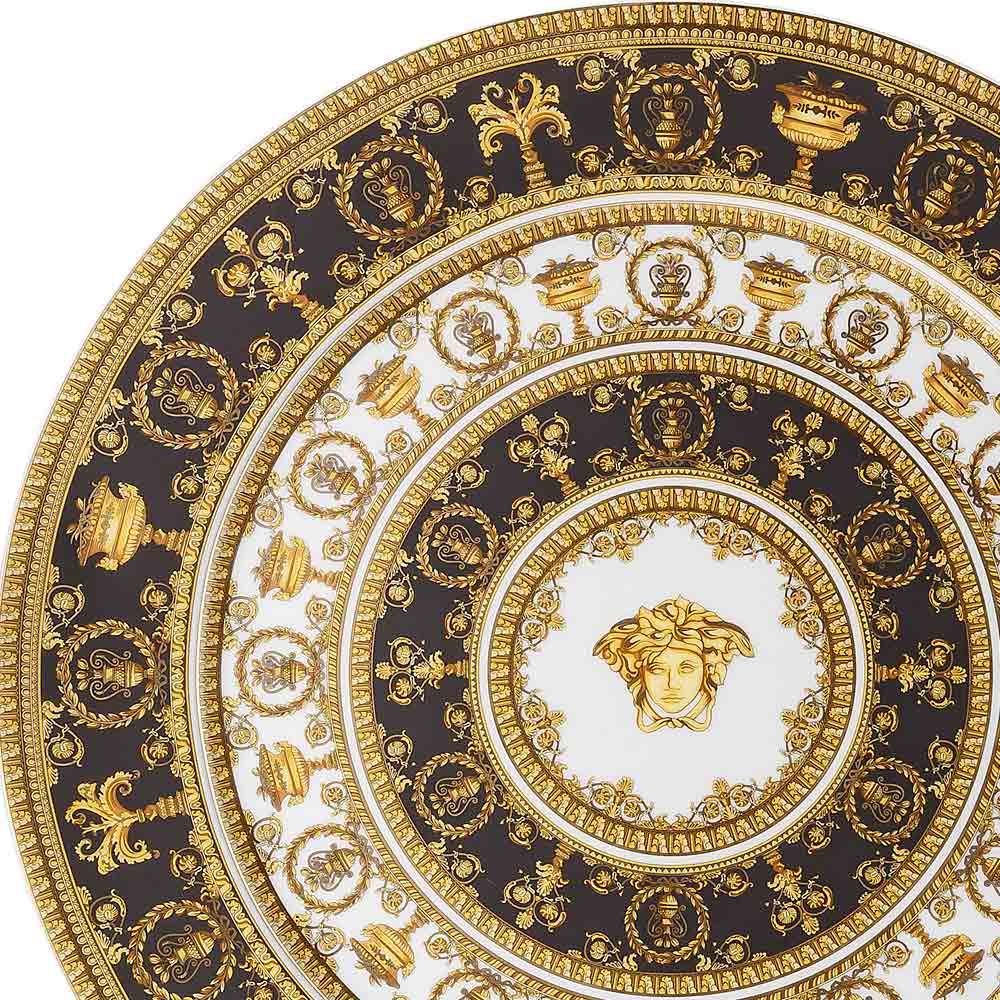 Il piatto segnaposto I Love Baroque di Versace, realizzato in preziosa porcellana, è un vero capolavoro di eleganza e raffinatezza senza tempo. Il suo design intricato è caratterizzato da ricchi dettagli barocchi dorati che si intrecciano con armonia su uno sfondo nero e bianco, regalando un effetto visivo di lusso esclusivo. Al centro troneggia l'iconico volto della Medusa, simbolo inconfondibile della maison, incorniciato da motivi ornamentali che esaltano la sua regalità.