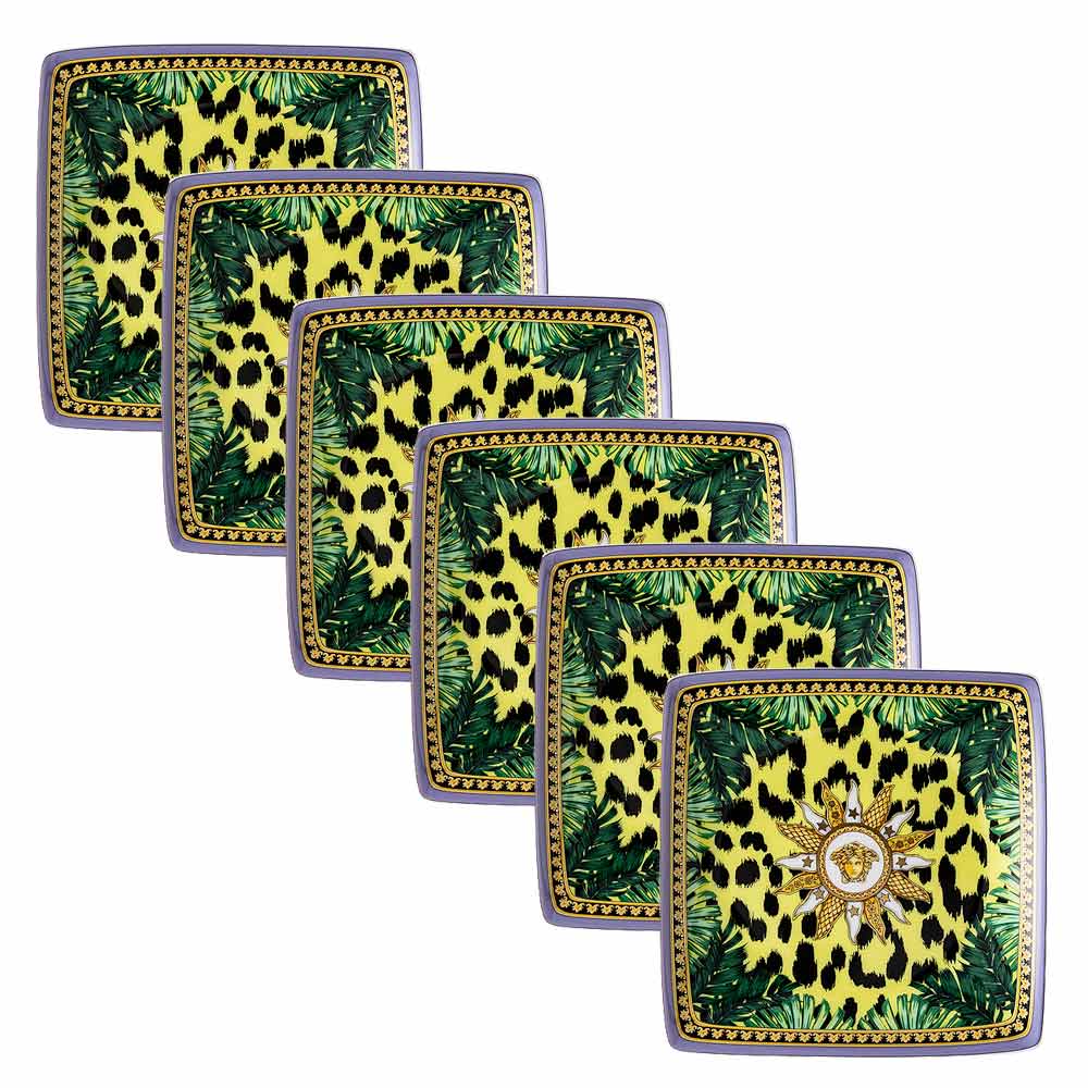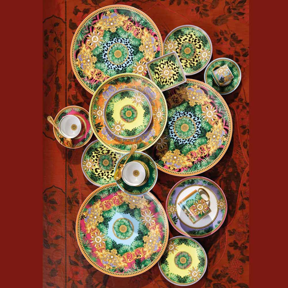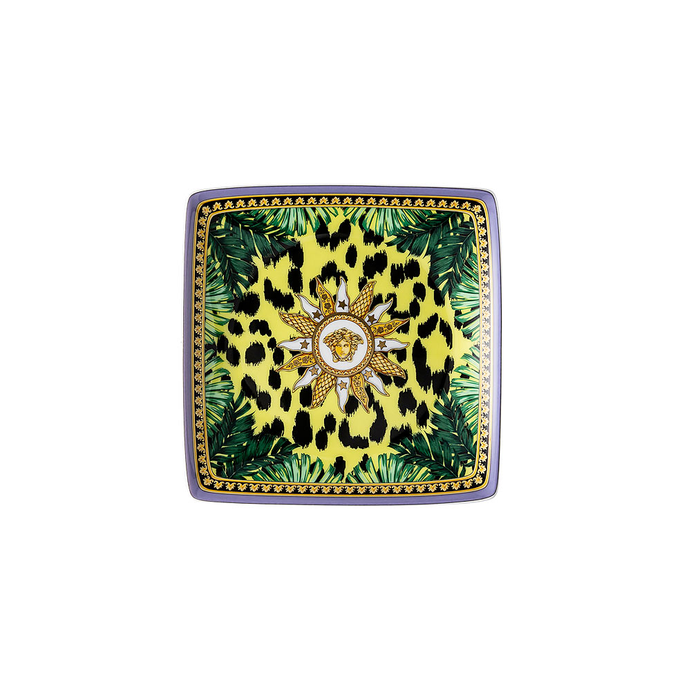 La coppetta Jungle Animalier di Versace, realizzata in pregiata porcellana, è un'esplosione di stile e lusso selvaggio. Il suo design accattivante combina un vivace motivo animalier su sfondo giallo, incorniciato da rigogliose foglie tropicali e dominato dall'iconico simbolo della Medusa, incastonato in un sole dorato e impreziosito da dettagli barocchi.
