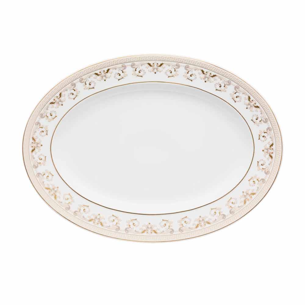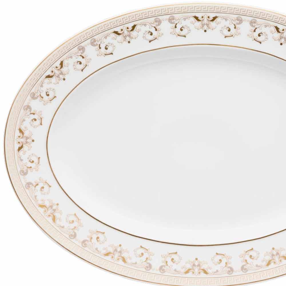Il piatto ovale 34x24,5 cm firmato Versace, fà parte della raffinata e lussuosa collezione tavola Medusa Gala.