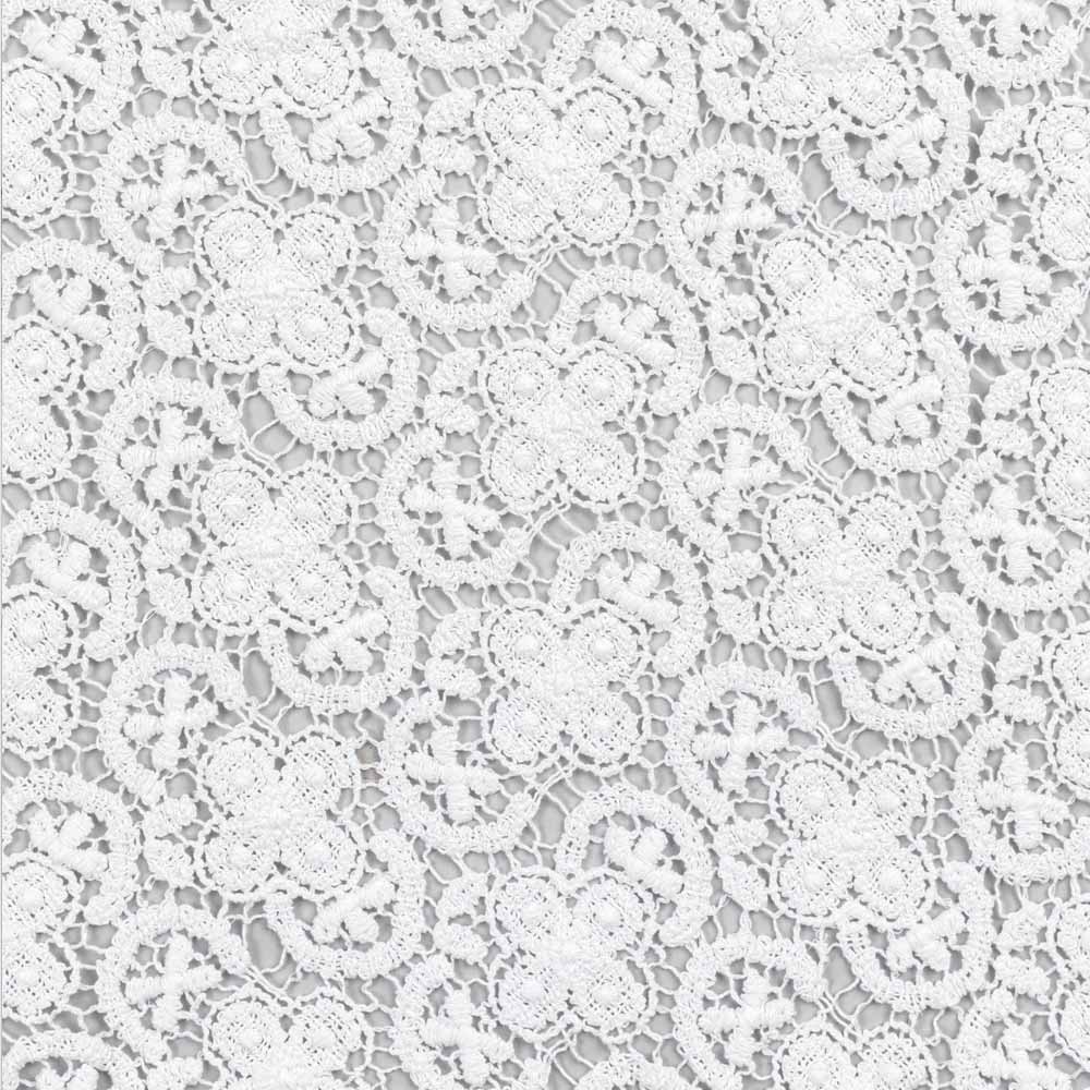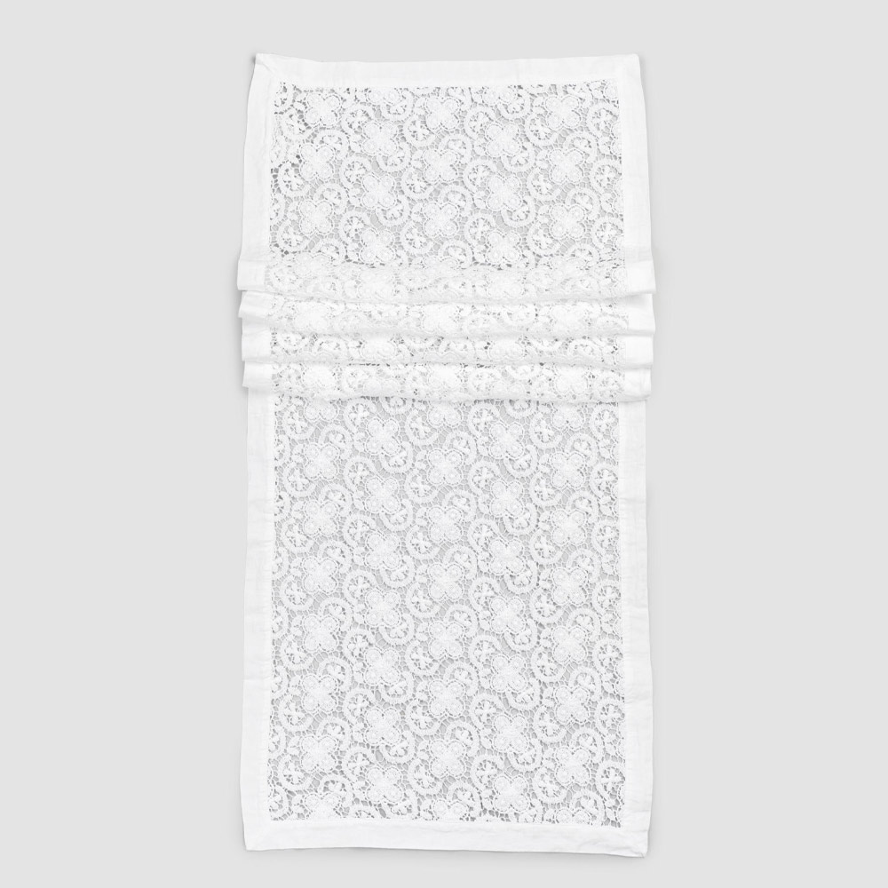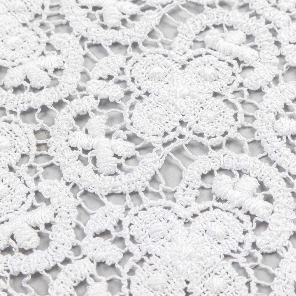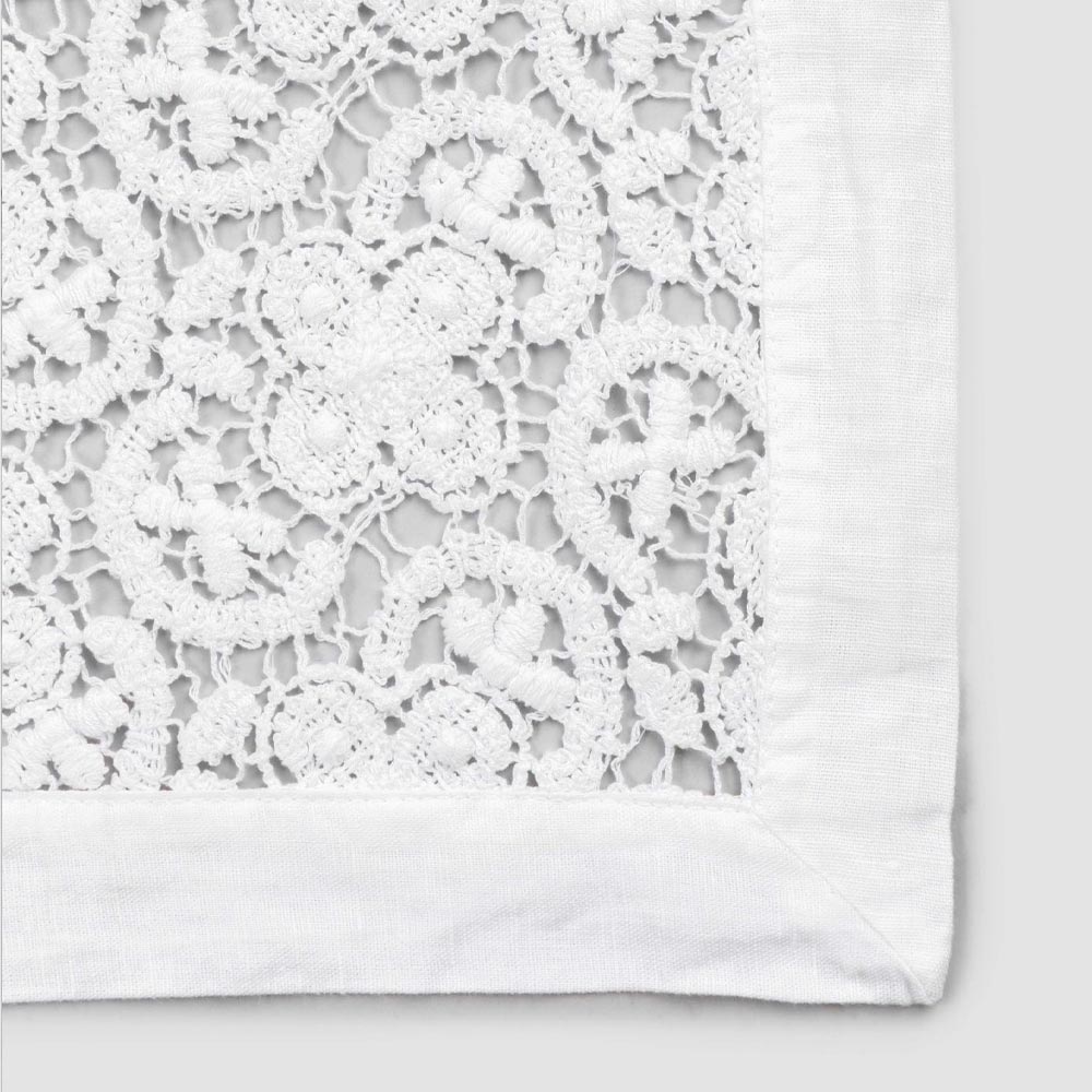 Il runner di decoro bianco è interamente ricamato in pizzo uncinetto e presenta un bordo in misto lino e cotone con piega.