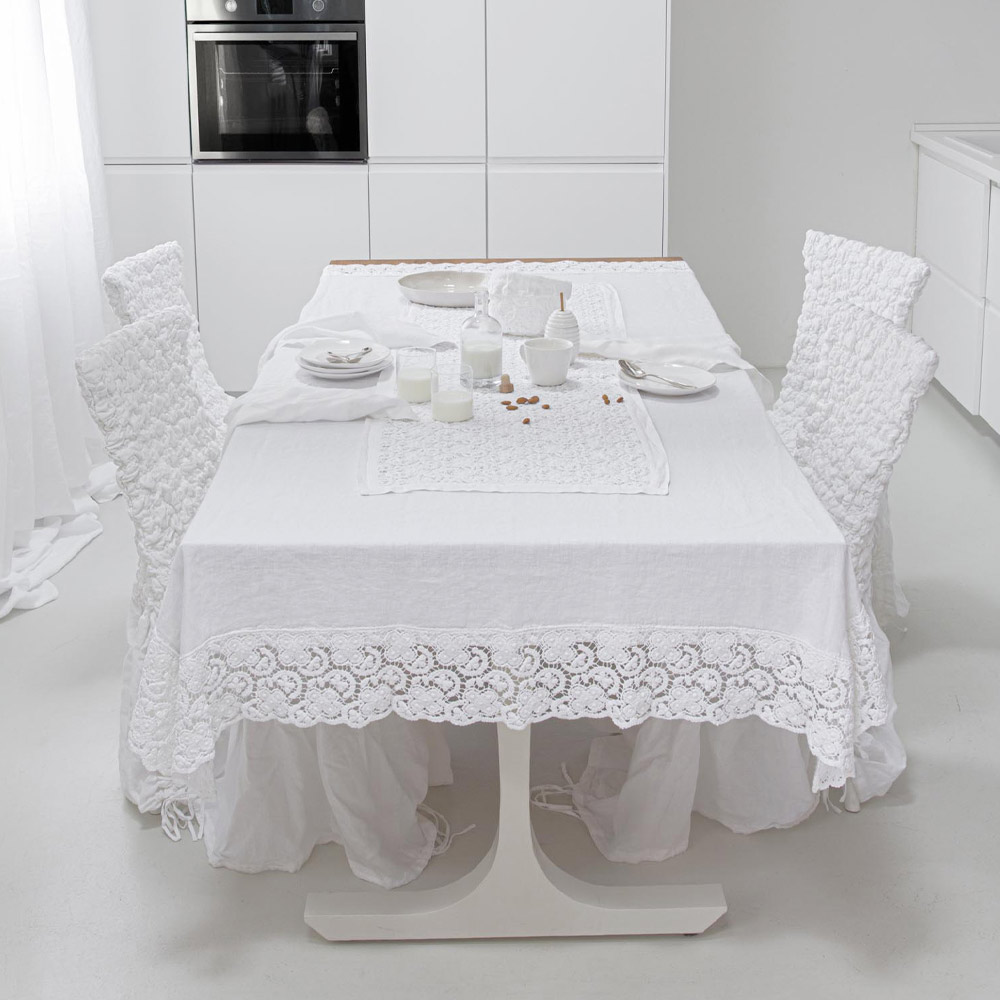 Runner in pizzo uncinetto con bordo misto lino e cotone da tavolo, design di lusso made in Italy.