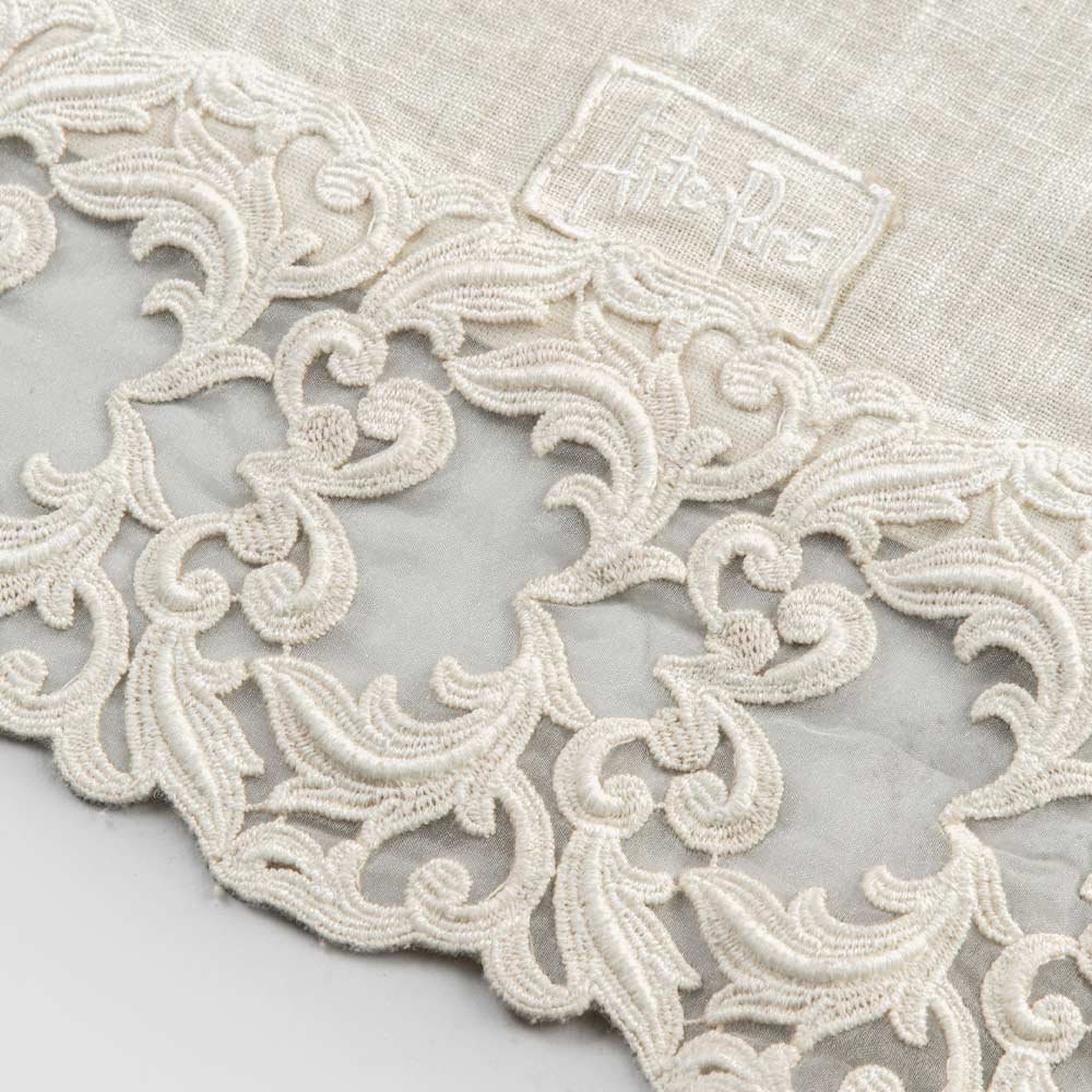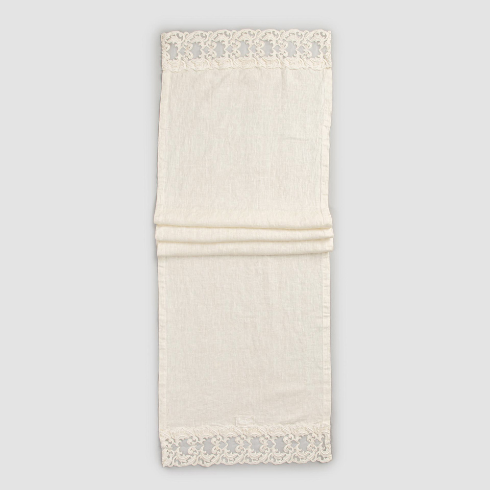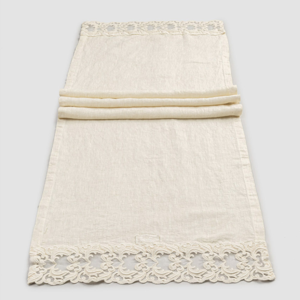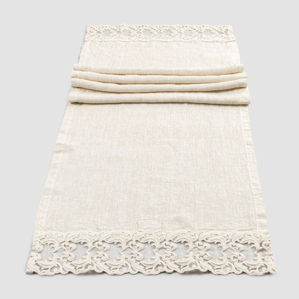 Runner da tavolo in lino pesante con pizzo e bordo con piega, lusso made in Italy.