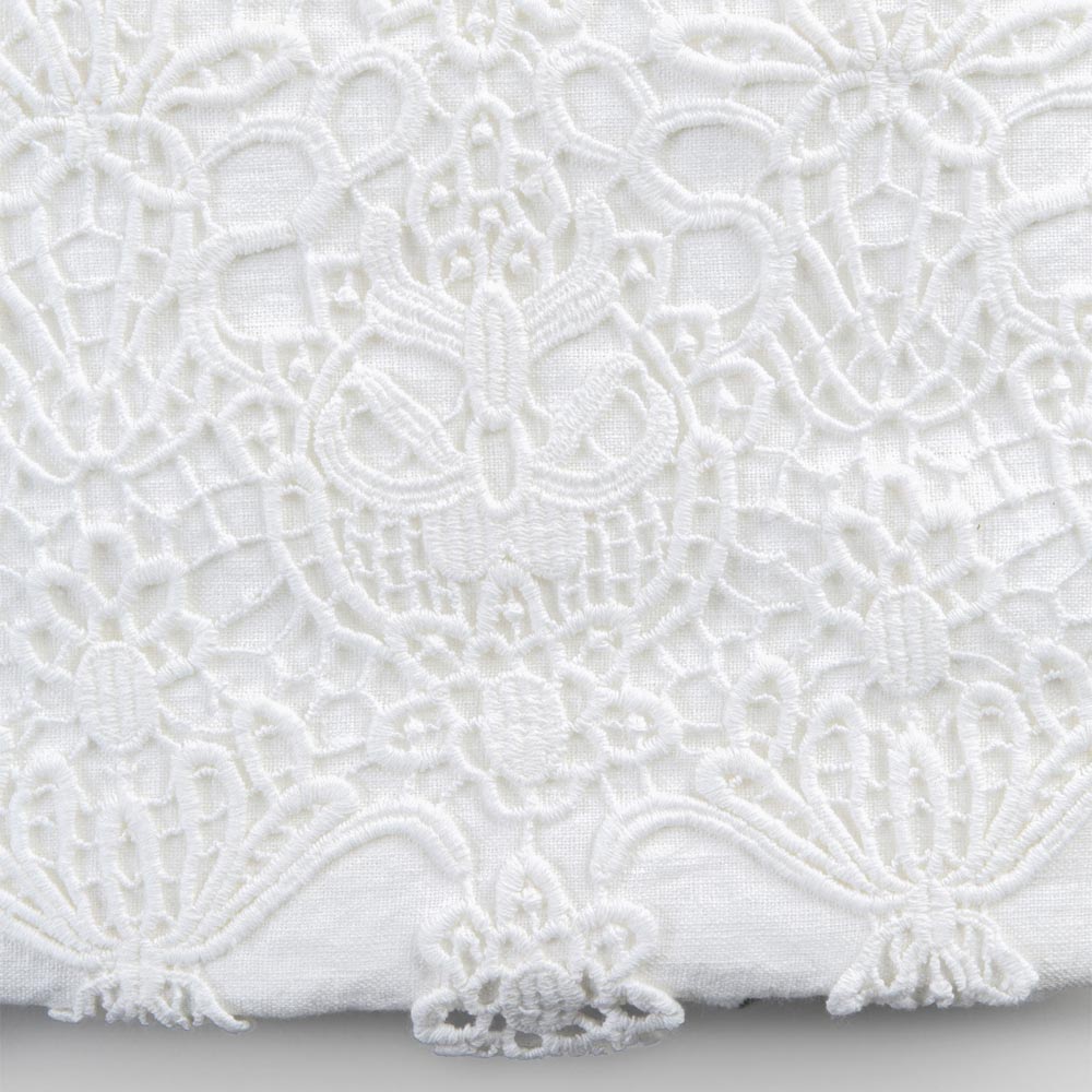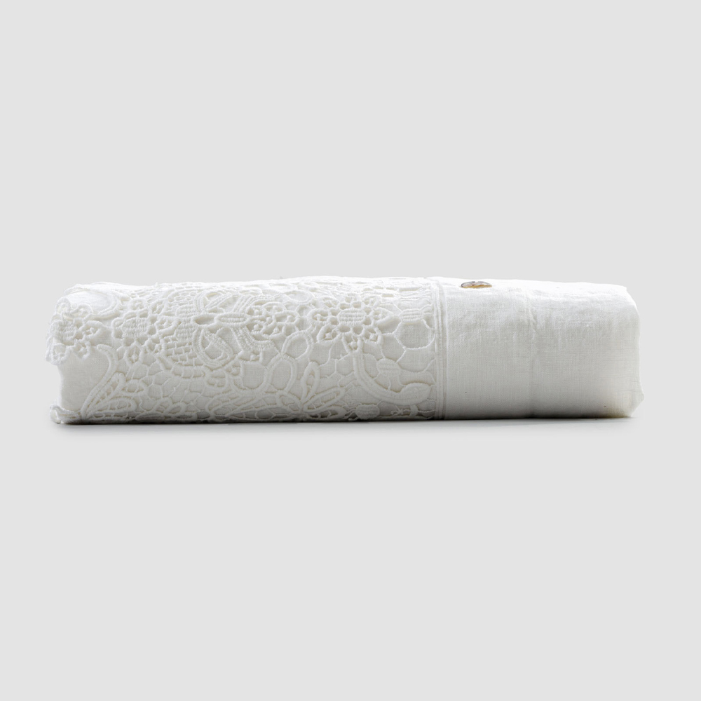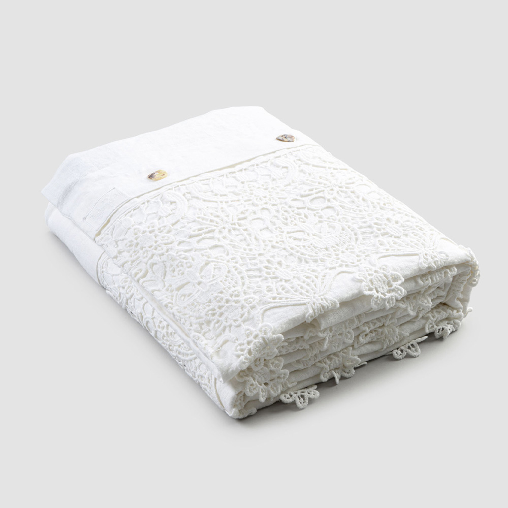 Copripiumone matrimoniale in lino bianco con pizzo gocce, design di lusso artigianale made in Italy.