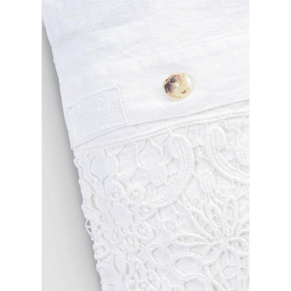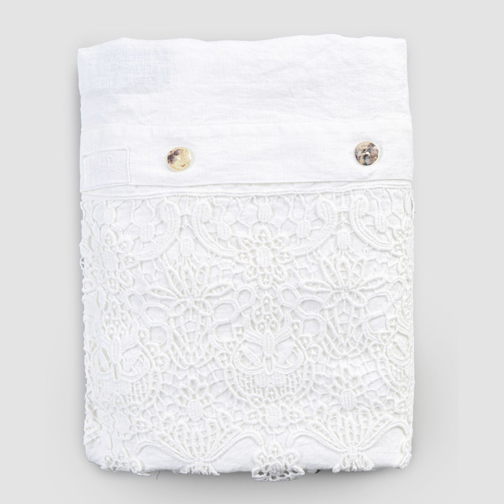 Il valore della tradizione si unisce allo stile di vita moderno con questo sacco contenitore in lino pesante bianco impreziosito con pizzo gocce e bottoni Agoya in madreperla.