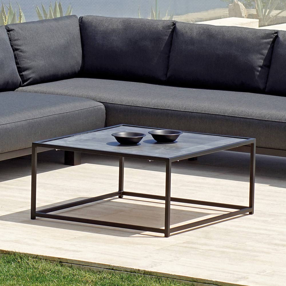 Salotto da giardino con 2 divani struttura in alluminio nero e tavolino in ceramica.