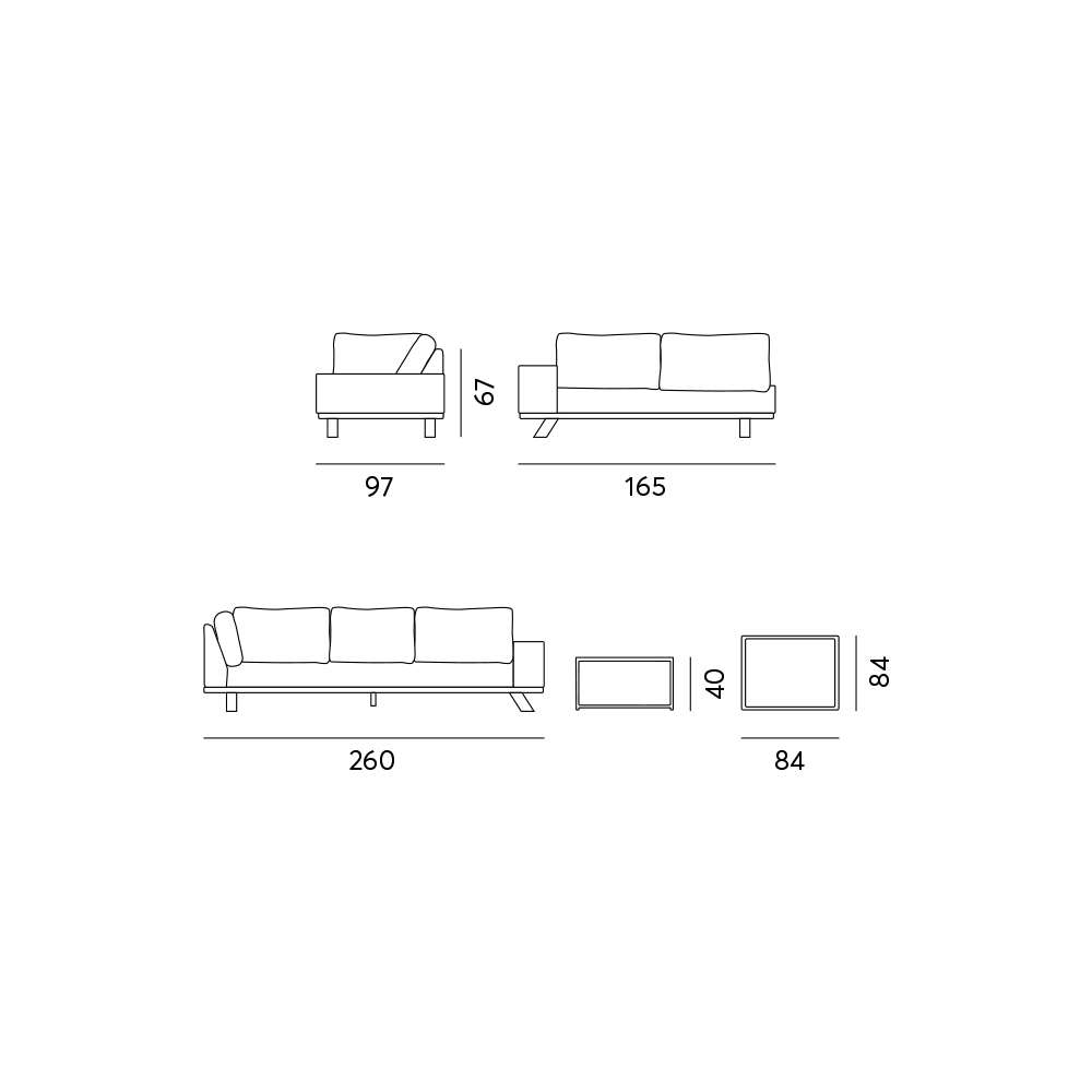- divano tre posti: L 260 x P 97 x H 67 cm;