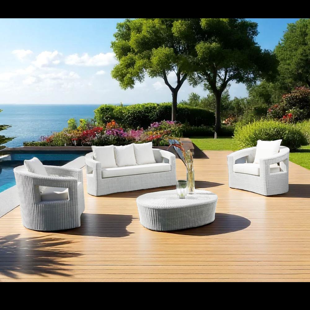 La struttura in polyrattan aggiunge un tocco di resistenza e durabilità contro le intemperie, mantenendo la sua bellezza nel tempo. Il tavolino abbinato è il complemento ideale per ospitare bevande e snack, rendendolo il set perfetto per i tuoi ospiti e per le tue serate all'aperto.