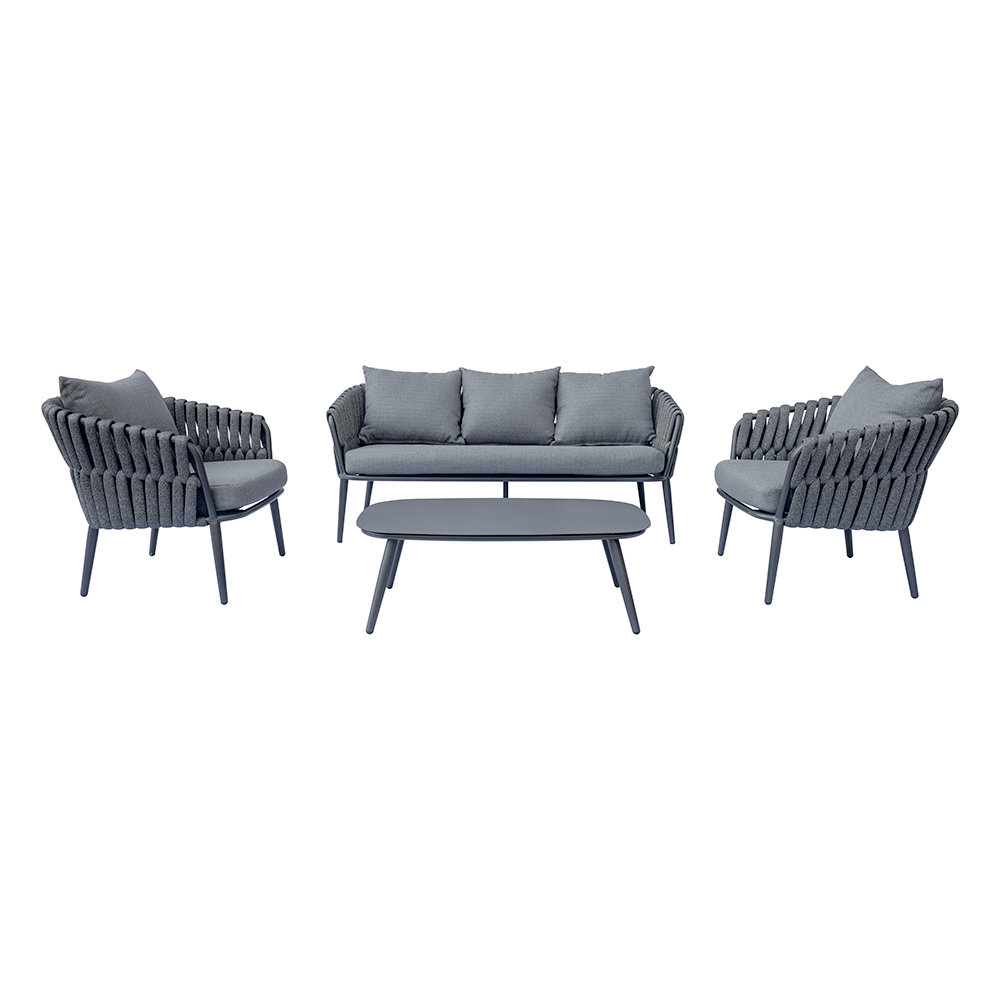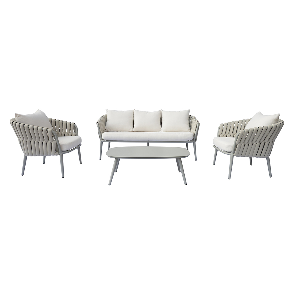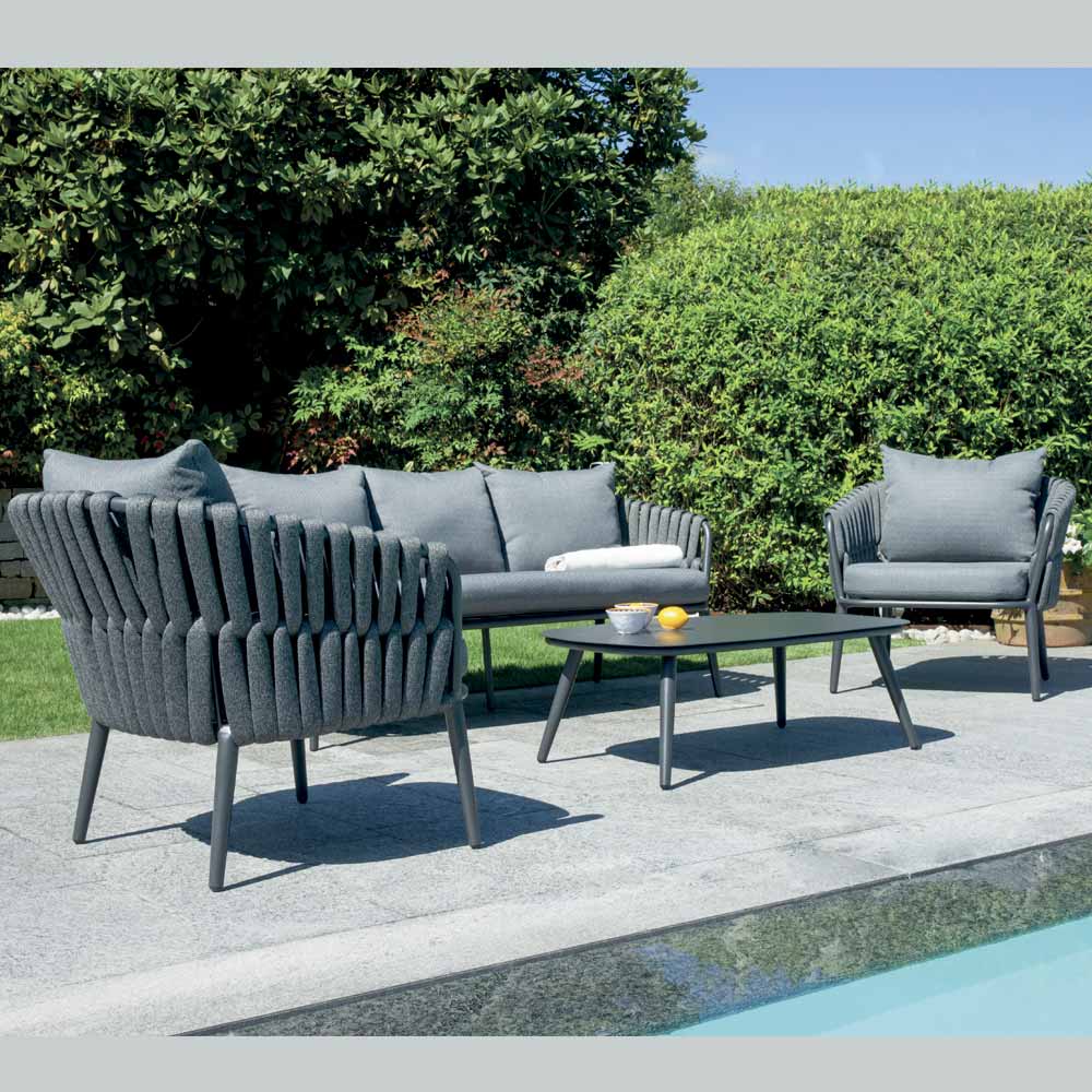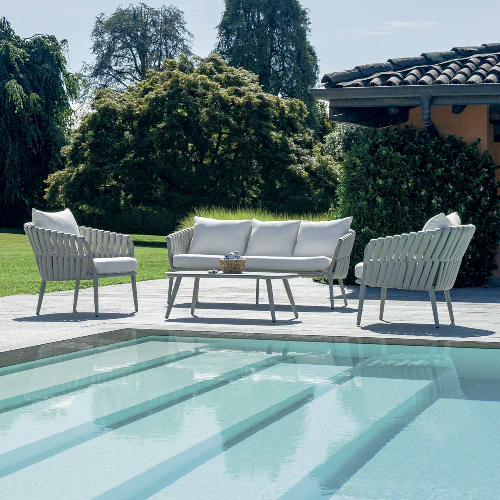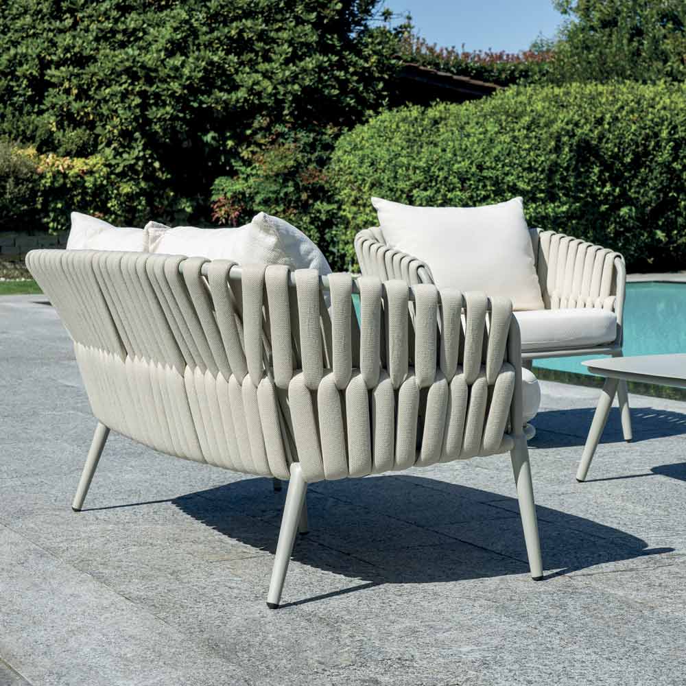 La struttura in alluminio assicura leggerezza e resistenza nel tempo, mentre la corda imbottita avvolge sedute e schienali, donando un tocco contemporaneo e al tempo stesso confortevole. I cuscini sfoderabili garantiscono praticità e facilità di pulizia, mantenendo intatto nel tempo l’aspetto elegante e curato del salotto.