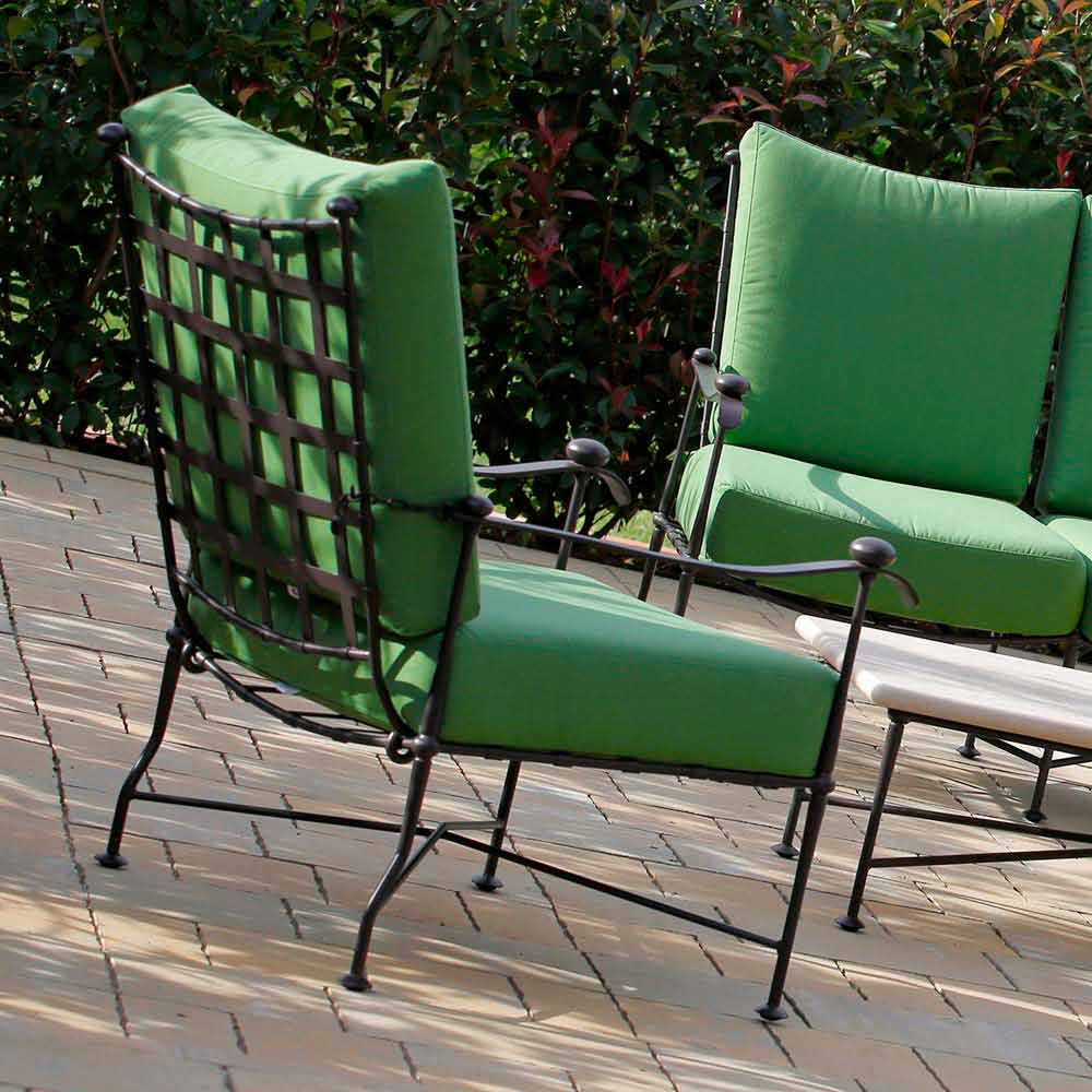 Salotto da esterno artigianale in ferro verniciato con cuscini Made in Italy.