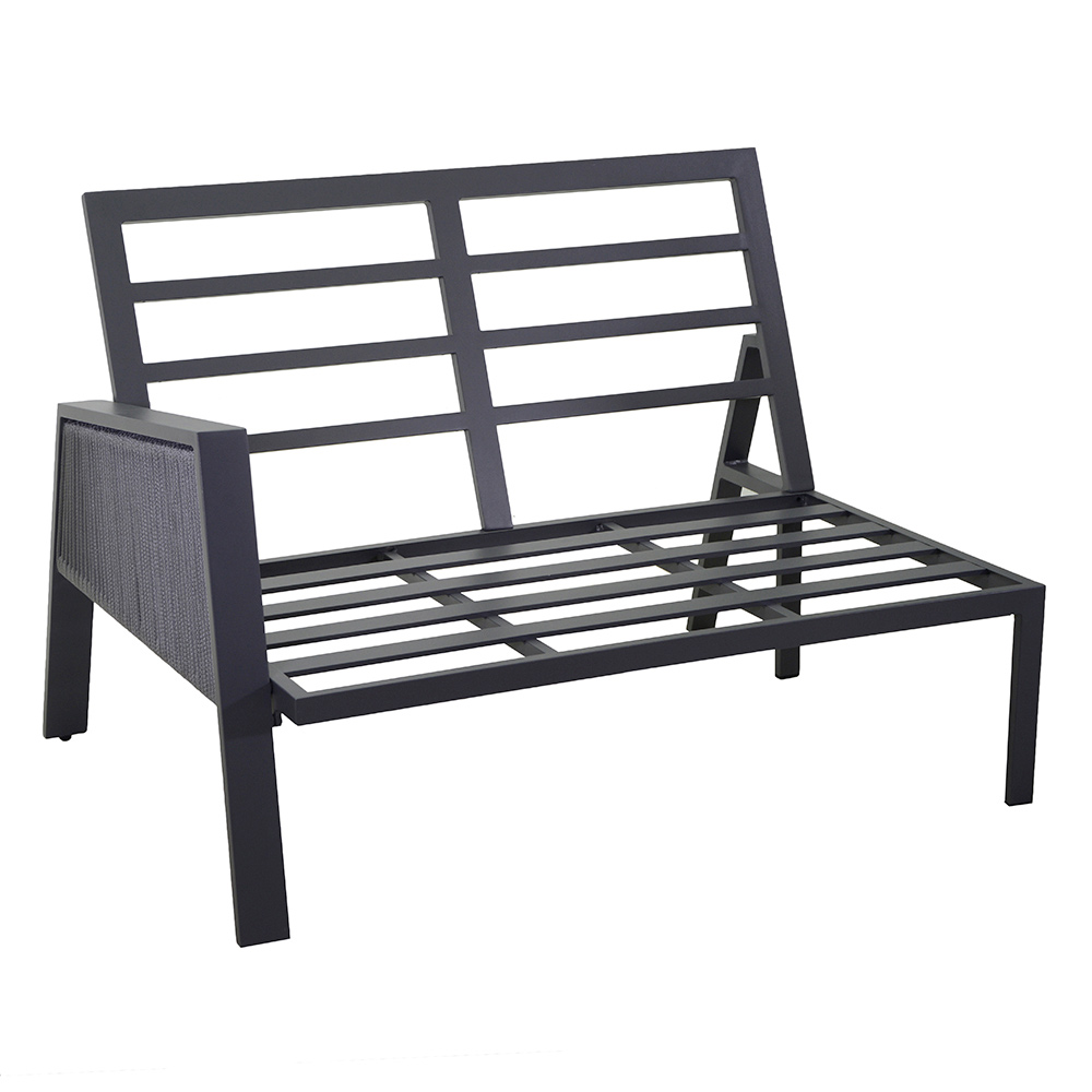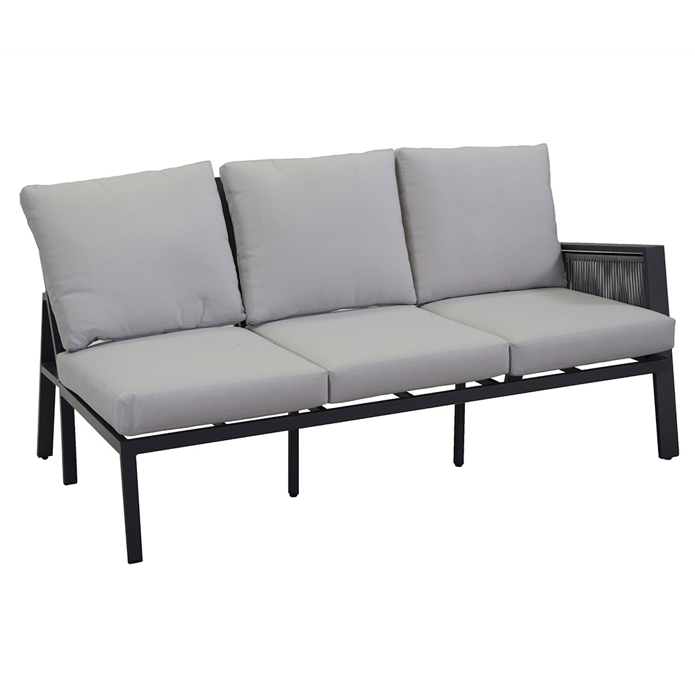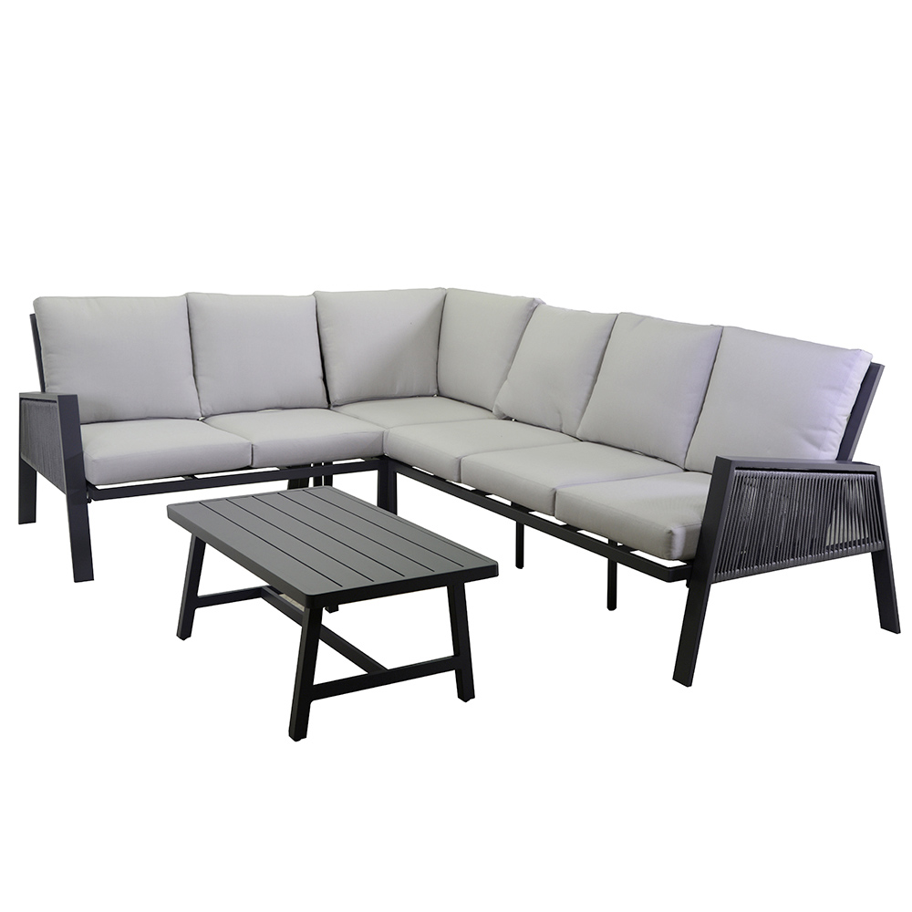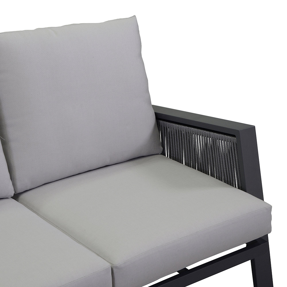 1 divano (una seduta 2 posti, una seduta angolare, una seduta 3 posti): struttura in alluminio antiruggine color antracite , corde in textilene color grigio chiaro e cuscini 100% Olefina idrorepellenti color grigio chiaro, sfoderabili.