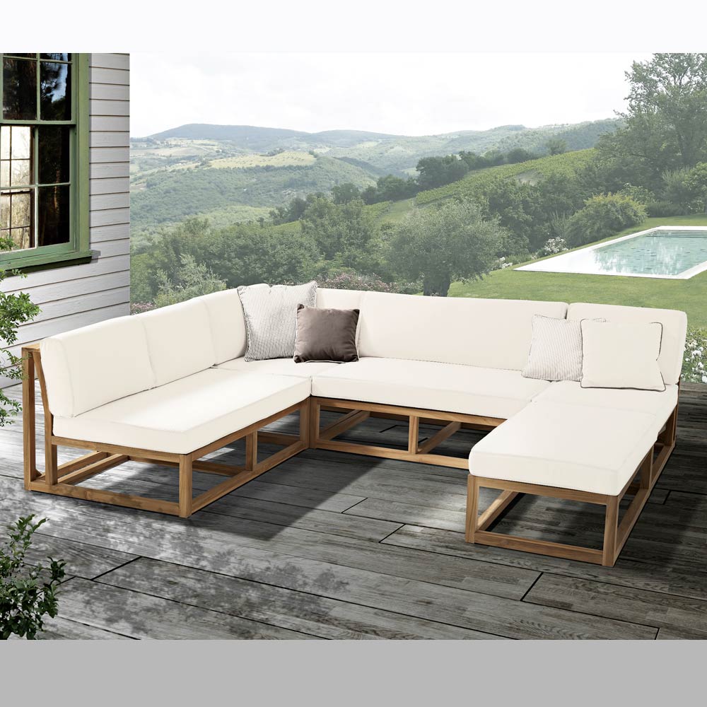 Salotto componibile da giardino in teak naturale e cuscini